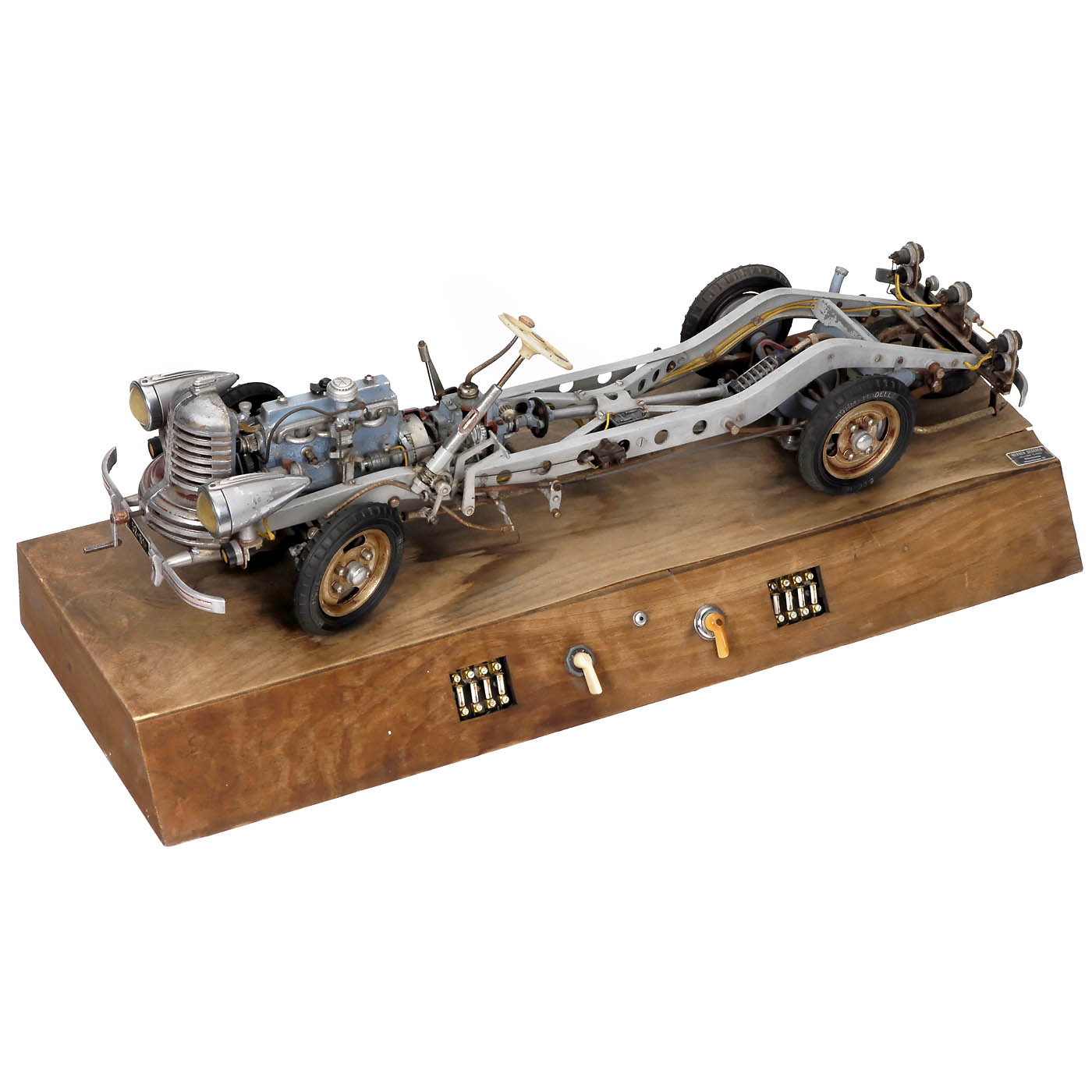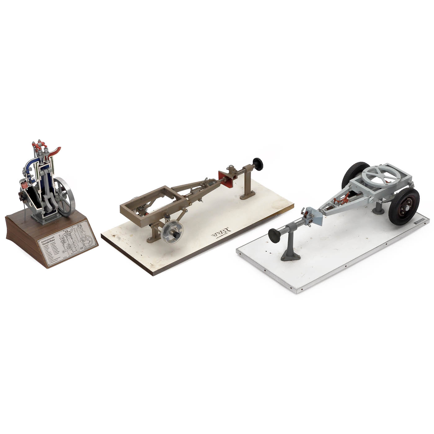 1) Demonstration model, Opel Kapitän radiator grill, with working engine, lights and steering mechanism, crank-drive, partly rusty, wood plinth damaged, in need of restoration, lg. 42 ½ in. - A fascinating exhibition piece and collector’s item! - And: 2) Demonstration model front light, Verkehrs Verlag Remagen (VVR), 25 x 16 ½ in.; 2 trailer models, VVR, to demonstrate overrun brakes; Höhm four-stroke engine cutaway model, with crank-drive.
