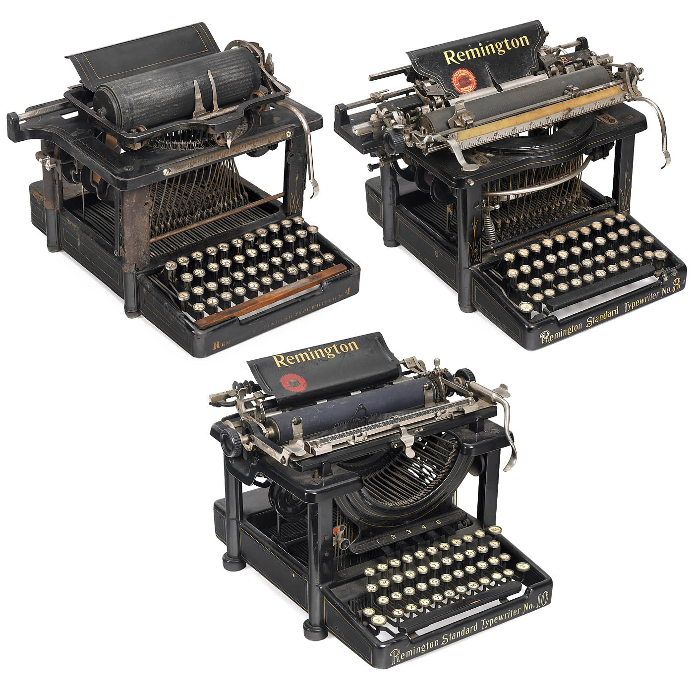 1) "Remington Standard No. 4", c. 1884, serial no. 922, early 4-row upstroke typewriter for capitals only, without shift, with thick platen (in the style of "Perfected Type Writer No. 4"), missing wood roller, otherwise working, paint damaged, with tin cover and oak base. (4/3–4) – 2) "Remington Standard No. 8", c. 1900, serial no. 36681, upstroke machine, wood typebars, with many improvements to Remington’s previous models, extra-wide carriage, carriage defective and loose on frame. (3/4–5) – And: 3) "Remington Standard No. 10", c. 1910, serial no. R843559, the first 'visible writing' machine made by Remington, with frontstroke, with tabulator, working. (3–4/3–4)