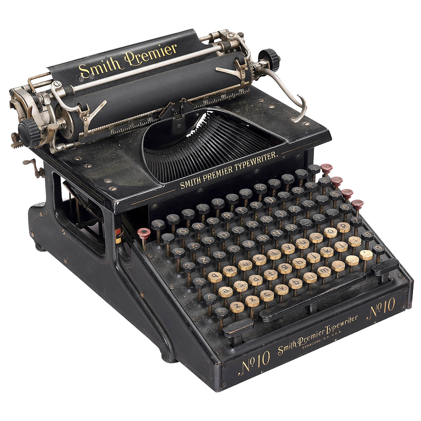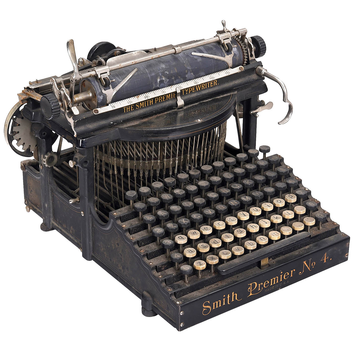 1) "The Caligraph No. 3", c. 1895, American Writing Co., New York, serial no. *7034, early American upstroke machine with full keyboard, 78 characters in six rows, artificial ivory keys, partly rusty, in need of cleaning. (4/4) – 2) "Smith Premier No. 10-A", c. 1915, serial no. 108678, frontstroke machine with full keyboard, working, in need of cleaning. – Literature: Martin, 1949, p. 109. (3/3–4) – 3) "Remington Standard No. 10", c. 1910, serial no. RA60442, the first 'visible writing' machine made by Remington, in need of cleaning. (3–4/3–4) – And: 4) "Smith Premier No. 5", c. 1905, Smith Premier Typewriter Company, Syracuse, full keyboard, 82 keys in 7 rows, upstroke, carriage movement defective. (3/4)