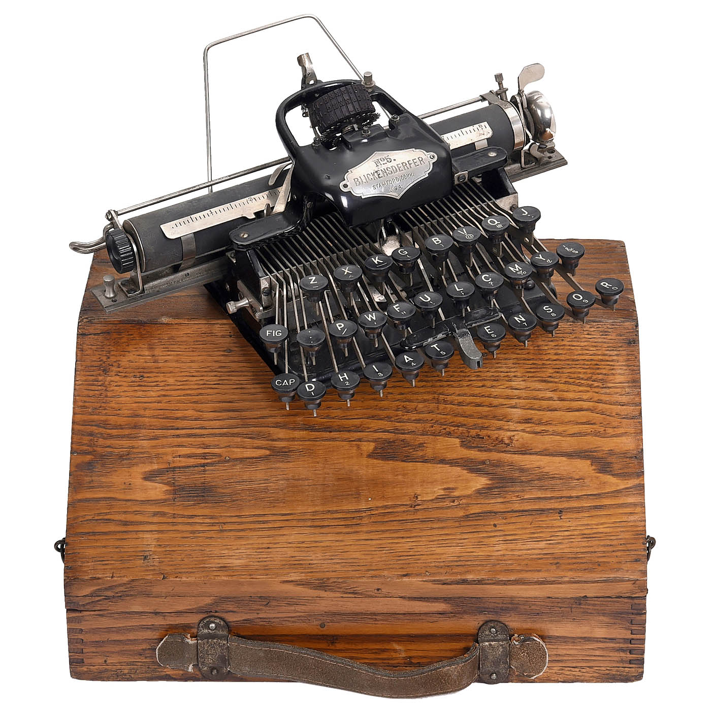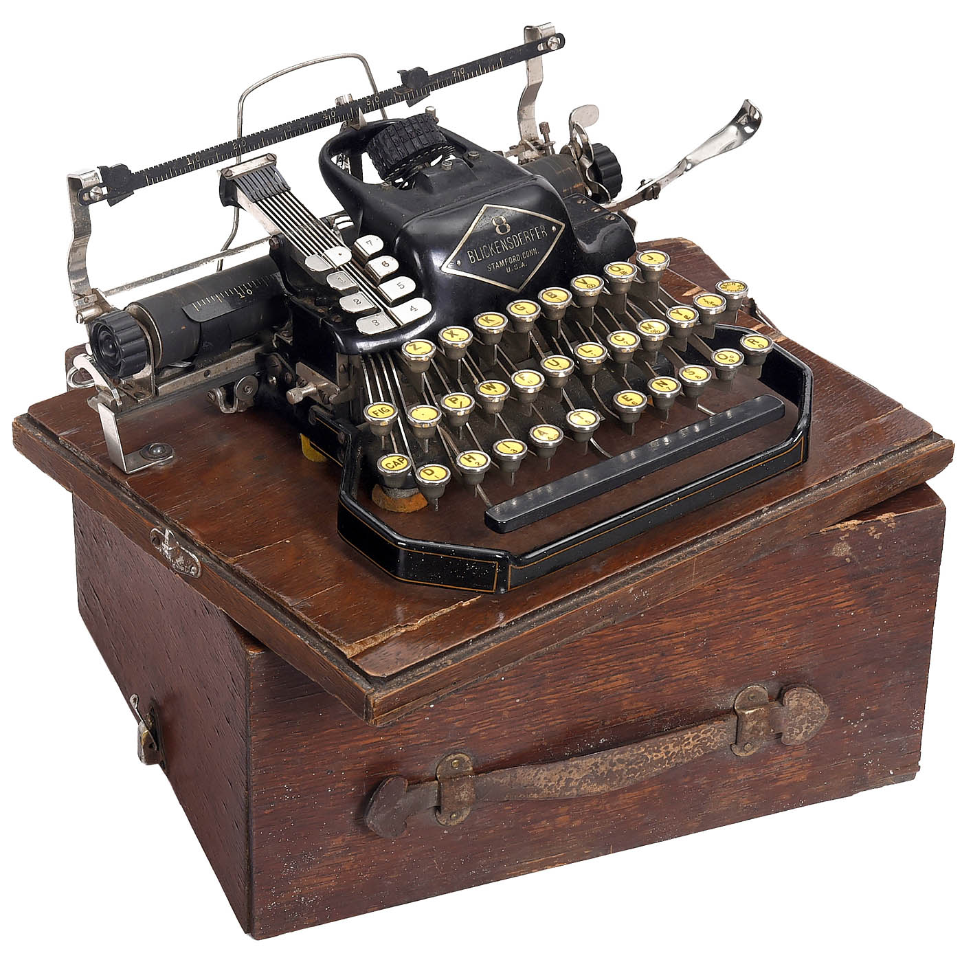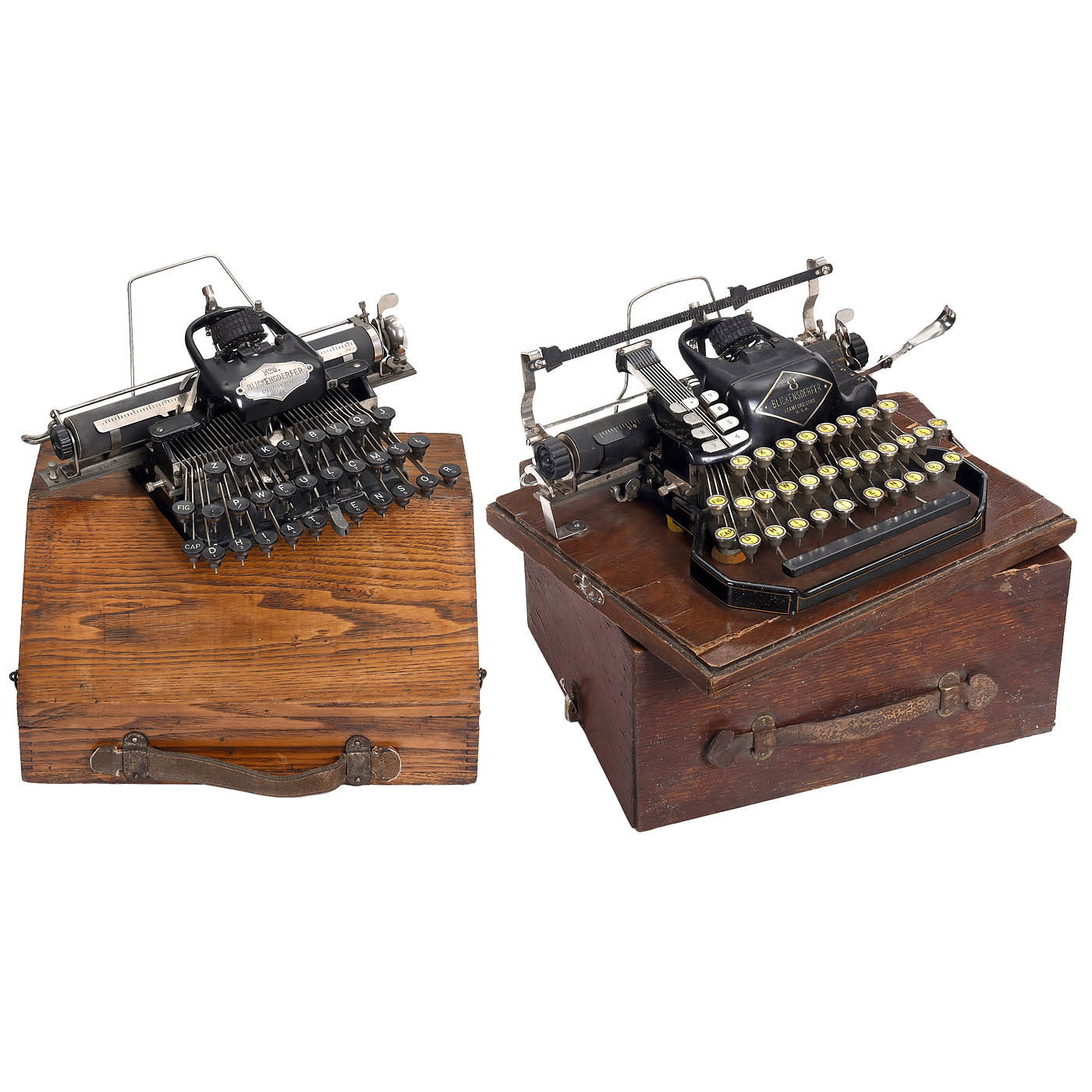 American portable typewheel machines, ink-roller, downstroke, 28 keys in three rows, two shift-keys, 84 characters, invented by George C. Blickensderfer (1850–1917) in 1891 and manufactured by the Blickensderfer Typewriter Co., Stamford, Connecticut, USA. 1) "Blickensderfer No. 8", 1909 onwards, American typewheel machine, decimal tabulator and a backspace key, carriage movement defective, with original oak case. – Literature: Martin, 1949, p. 136. (2–3/3) – And: 2) "Blickensderfer No. 5", 1894, serial no. 99021, DHIATENSOR keyboard, with original oak case. (2–3/2–3)