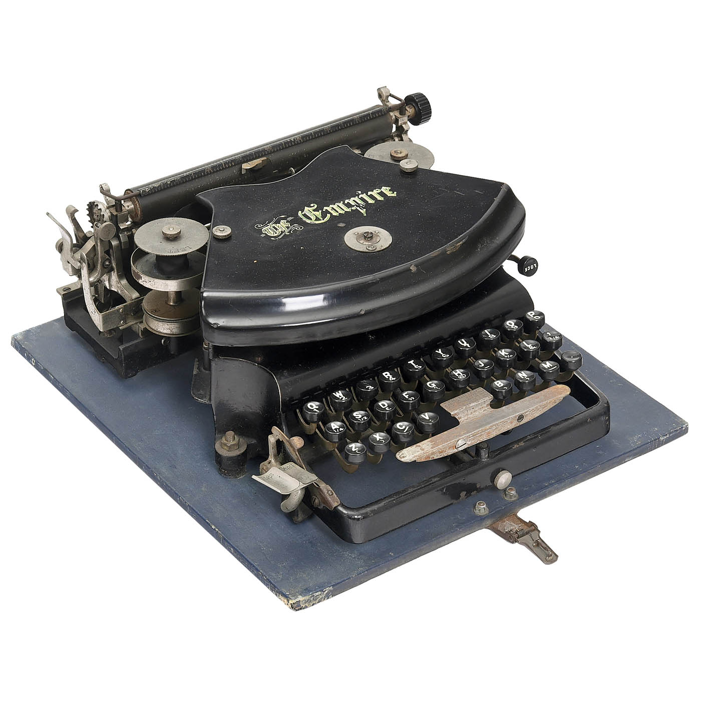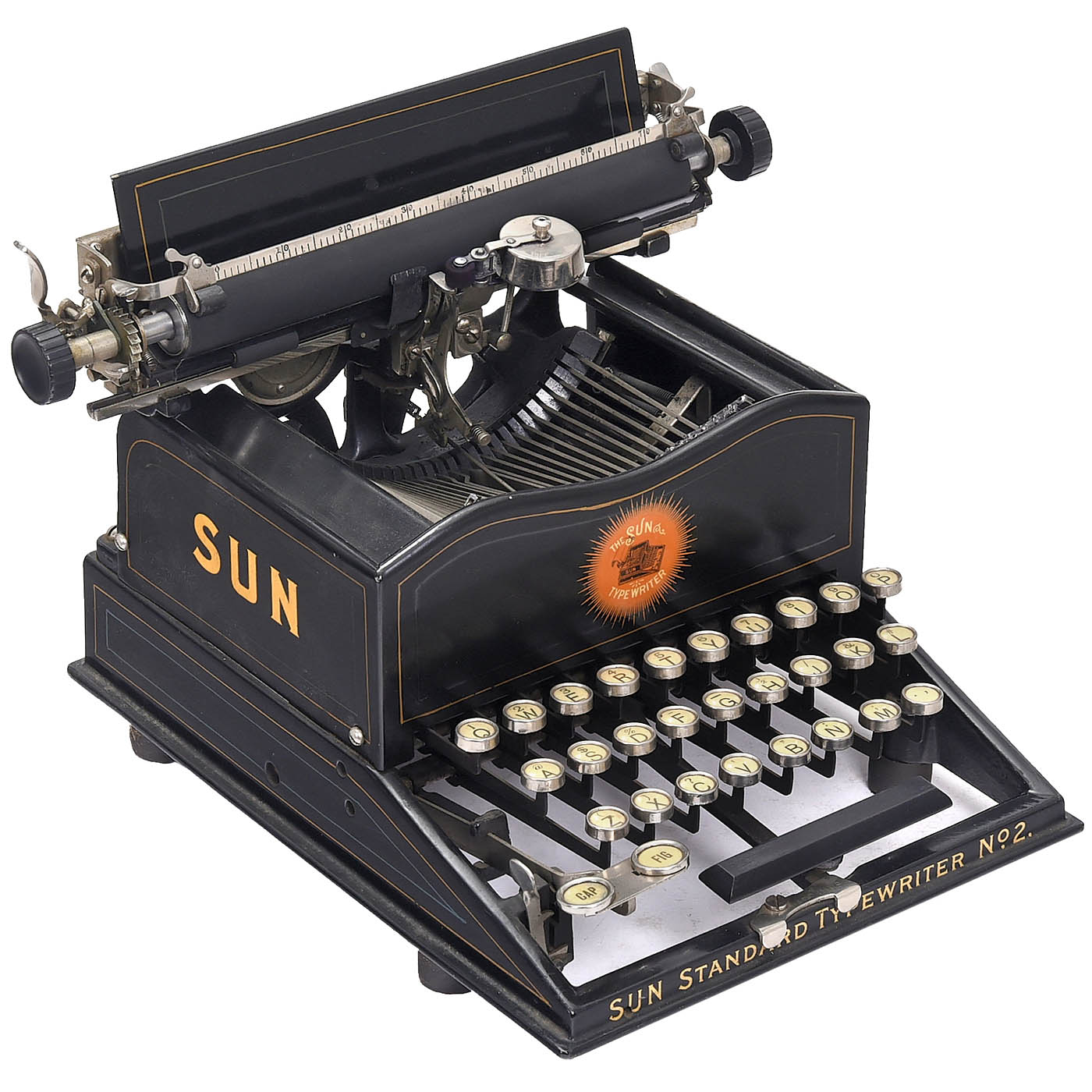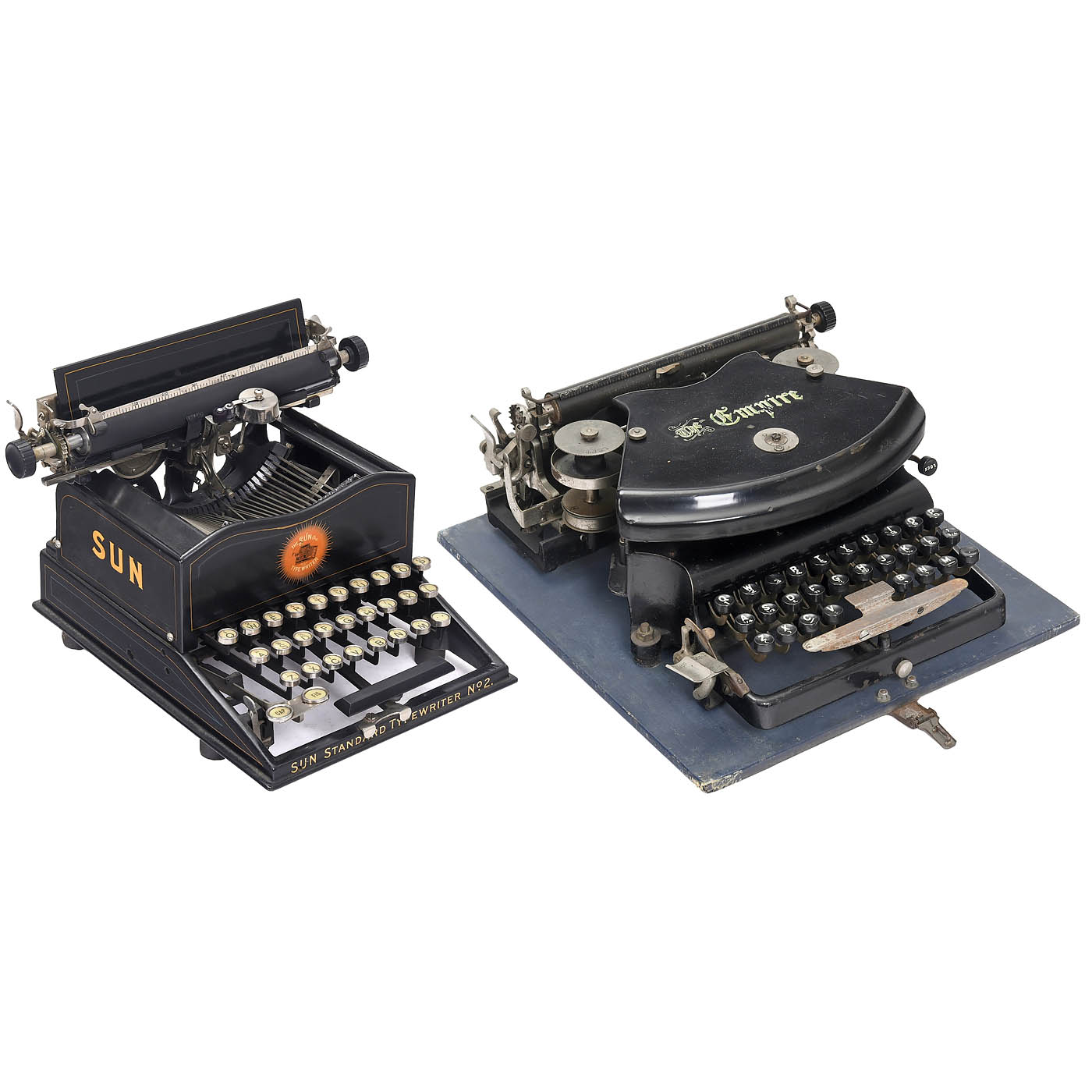1) "Sun Standard No. 2", 1901 onwards, serial no. 16209, three-row frontstroke typewriter with unusual inking mechanism, with tin cover and wood base, working. (3/2–3) – And: 2) "Tne Empire No. 1", c. 1902, serial no. 19530, Williams Manufacturing Company, Montreal, Canada, thrust-action double-shift typewriter, 28 keys, working, in need of cleaning, with cover and wood base. (3/3)
