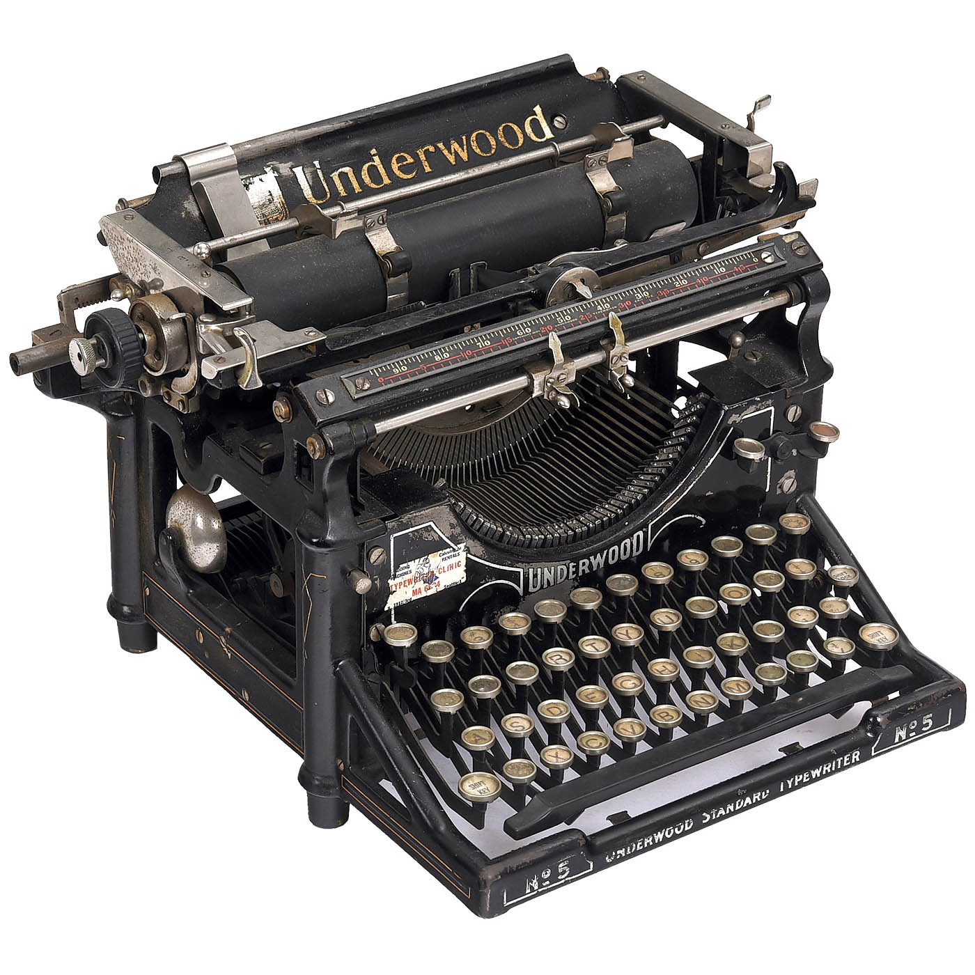 1) "Remington Standard No. 2", 1890, serial no. 91202, American upstroke machine, missing paper table, carriage movement defective. Successor to the famous Sholes & Glidden, the first successful typewriter in the world. (4/4) – 2) "Underwood Standard No. 5", c. 1920, no. 861922, four-row frontstroke machine, 84 characters, somewhat dirty, working, carriage movement stiff. (3/3) – 3) "The Fox No. 25", c. 1912, attractive decoration, working. (2/2) – And: 4) "Densmore No. 5", c. 1905, serial no. 41088, American upstroke machine with ball-bearing typebar mechanism and carriage, working, with tin cover and wood base. (2–3/2–3)