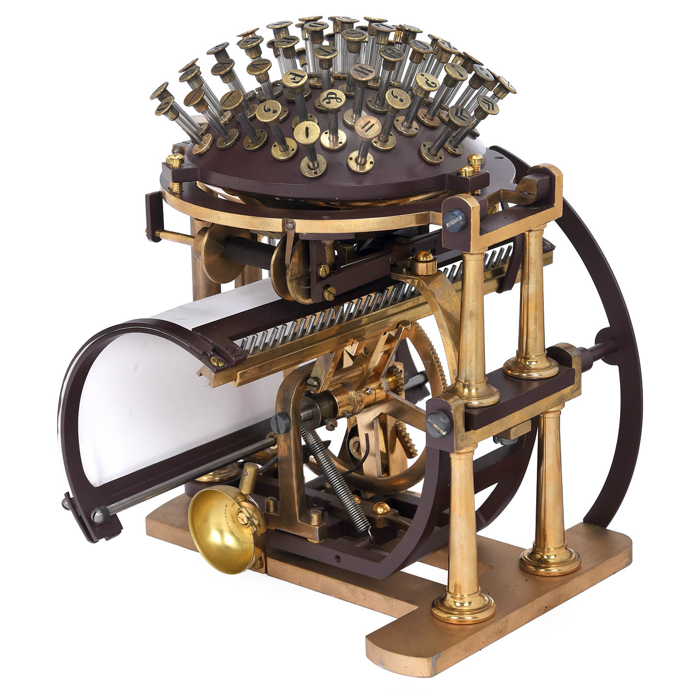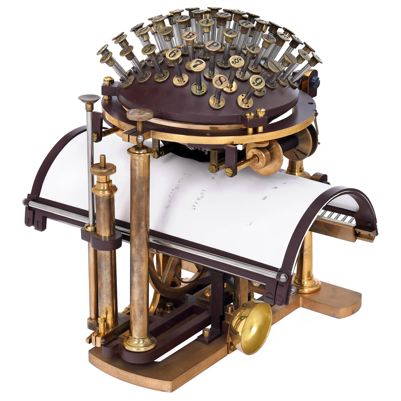 With hemisphere of 54 spring-loaded and engraved alpha-numeric typebars supported on 3 brass columns with set-screw adjustment and geared mechanism, diameter of hemisphere 5 ¼ in. (13,5 cm), approx. ht. 8 ½ in. (21,5 cm), in fitted mahogany case, a faithful working replica of this iconic writing machine, in excellent general condition. – The "Writing Ball" is considered the first commercially-produced typewriter. Reverend Rasmus Malling-Hansen, principal of the Royal Institute for the Deaf and Dumb, Copenhagen, designed his unique ergonomic typewriter in 1865 to help students to "speak with their fingers". "In a given time one can say five times as many sounds as can be written", he argued in his patent application of 25 January 1870. "In other words, one speaks five times as fast as one writes". Malling-Hansen positioned letters, numbers and symbols on a hemisphere to facilitate "quick writing", the vowels operated by the fingers of the left hand, the consonants by the fingers on the right. The intended result – the writing speed would be "easily two to three times as fast as normal, and practice in using the apparatus should be able to bring this speed up to speech speed." – Each of the 54 typebars is aligned at a different angle, yet all converge on the paper at a common point. The beauty of Malling-Hansen's design was not restricted to the layout of the typebars, but displayed all the significant refinements of writing machines introduced 40–50 years later: automatic carriage return and line spacing, a space bar, a bell to signal the end of the line, provision for carbon paper copies, a ribbon reverse and – most significant of all – visible writing by raising the typing mechanism. – The Writing Ball's most celebrated user – but not its happiest – was the German philosopher Friedrich Nietzsche. "Hurrah! The machine has arrived at my house!" wrote Nietzsche to his sister on 11 February 1882 upon the delivery of the machine he had ordered for 375 Danish crowns the year before. Beset by failing eyesight, the philosopher had hoped that the new invention would allow him to write more easily. Despite his initial excitement, Nietzsche eventually gave up on the intricate machine after it was damaged during a trip to Genoa, Italy, though not before immortalizing his struggle in verse: "The writing ball is a thing like me:/Made of iron yet easily twisted on journeys/Patience and tact are required in abundance/As well as fine fingers to use us." – Fortunately for its inventor, not all of the reviews were so negative. A journalist visiting the Paris World's Fair in 1878 compared the Writing Ball favorably with the new Sholes & Glidden "Typewriter" introduced by E. Remington & Sons of Ilion, New York, in 1874. "The Danish apparatus has more keys, is much less complicated, built with greater precision, more solid, and much smaller and lighter than the Remington, and moreover, is cheaper." – From a total of only 180 machines produced, only 35 are believed to have survived: 30 in museum collections, a handful still in private hands. – Literature: Ernst Martin (1949), "Die Schreibmaschine und ihre Entwicklungsgeschichte", pp. 60, 351 and 460. – For background on Nietzsche's machine: http://www.openculture.com/2013/12/friedrich-nietzsches-curious-typewriter.html. – A fabulous icon of design as well as an important historical document for the entire history of communication!