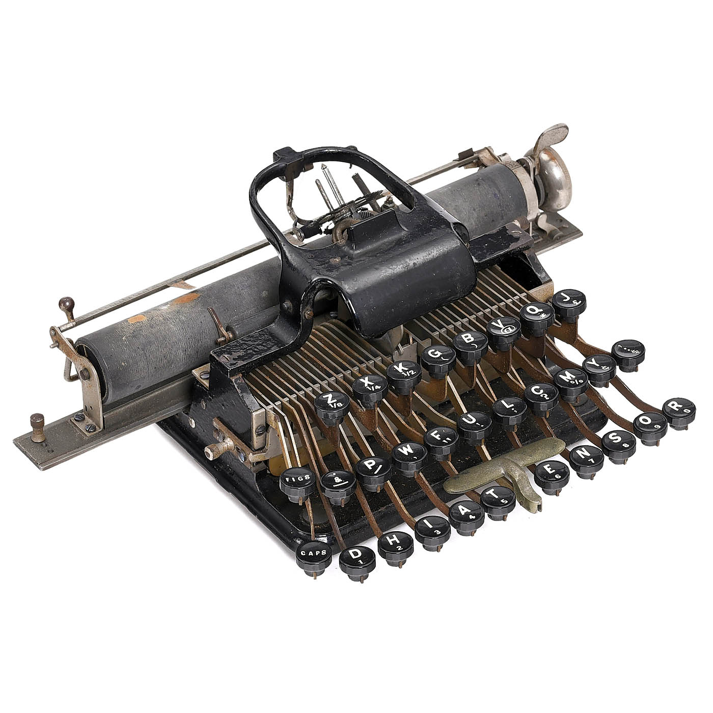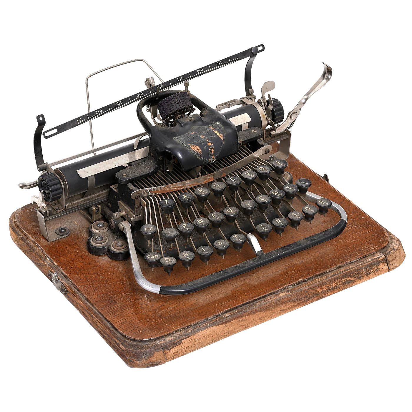 American portable typewheel machines, ink-roller, downstroke, 28 keys in 3 rows, 2 shift-keys, 84 characters, invented by George C. Blickensderfer (1850–1917) in 1891 and manufactured by the Blickensderfer Typewriter Co., Stamford, Connecticut. 1) "Blickensderfer No. 5", 1894, serial no. 2878, early version without manufacturer’s plaque, DHIATENSOR keyboard, carriage movement somewhat stiff, typewheel detached (included), with case. (3/4) – 2) "Blickensderfer No. 8", 1910, serial no. 121259, DHIATENSOR keyboard, mechanism stiff, with second typewheel and case. (2–3/4) – And: 3) "Blickensderfer No. 7", 1898 onwards, serial no. 92421, DHIATENSOR keyboard, mechanism sticks, inch-scale missing a screw, in wood case. – Literature: Martin, 1949, p. 136. (3/4)