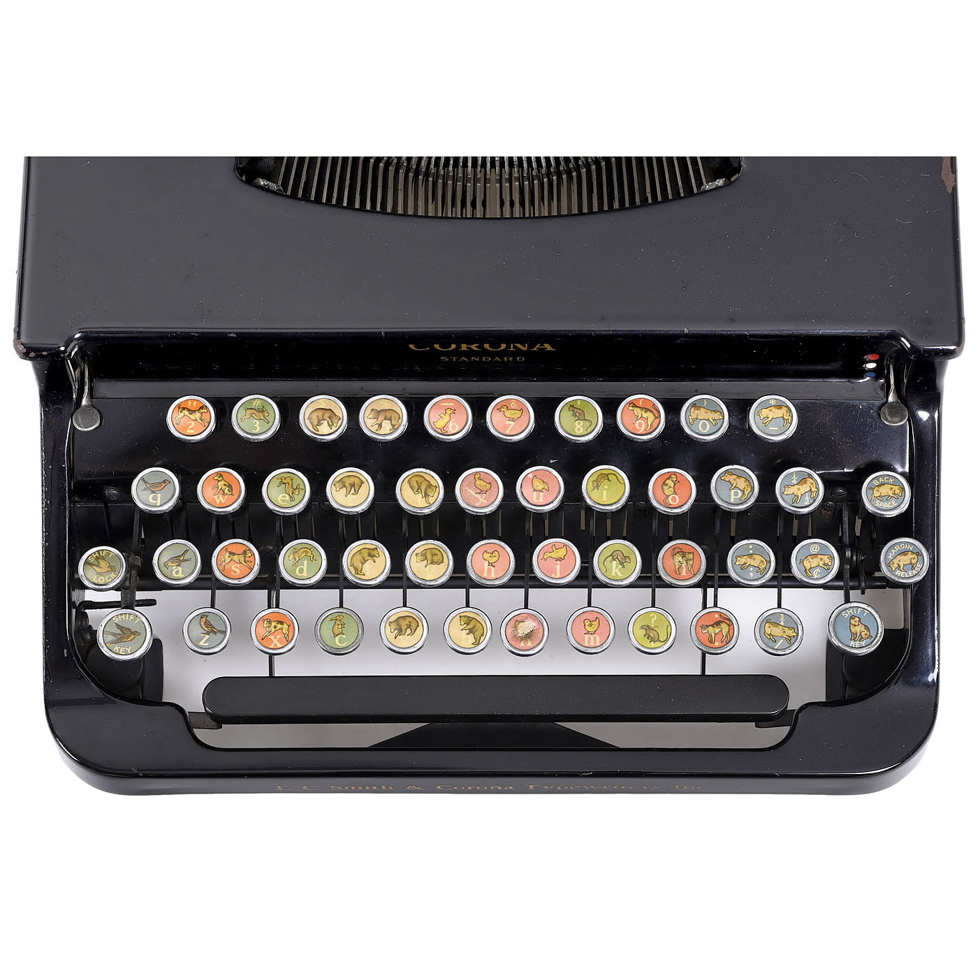 L.C. Smith & Corona Typewriter Inc., Syracuse, New York. Marketed with the slogan "A gift to help little fingers guide eager young minds". – The company equipped normal portable typewriters, in this case the model "Sterling", for the small surcharge of 2.49 US dollars with the "Animal Keyboard". U.S. design patent no. 100245 was granted to Myrtle R. Keller in 1936 for this ornamental innovation. All the animal illustrations were by Byron Glee Newton, a well-known American artist. In the pre-Christmas period of 1935, Corona began advertising this high-quality model. However, during the Great Depression, money was scarce and expensive toys were an extravagance, thus few machines were sold.