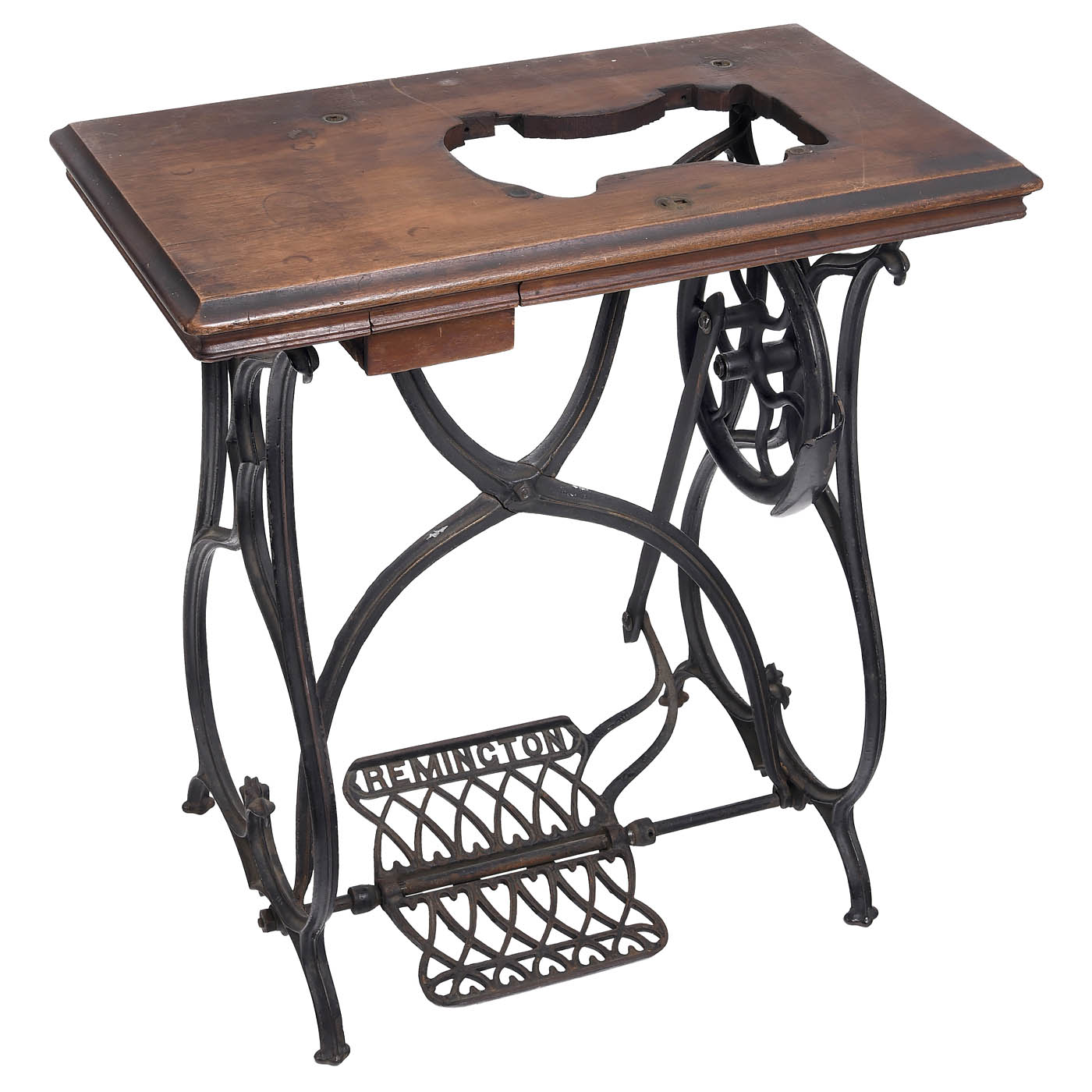 Cast-iron frame, belt-drive for leather straps, treadle-operated, walnut plate with recess for a sewing machine, overall dimensions 27 ½ x 15 ¾ x 28 ½ in. – Note: The Remington Company, a booming producer of weapons, sewing machines and many other mass products, was very interested in technical developments and was also looking elsewhere for more products to make and sell. They signed an exclusive contract for the production of typewriters with the developer Christopher Latham Sholes. The Remington 1 was the result. It is similar in style and painting to the sewing machines of the same period as components from the factory were used for both product lines. A sewing machine table of slightly different design was located under the first typewriter and the treadle was used to reset the platen. – An interesting addition to a Remington collection.