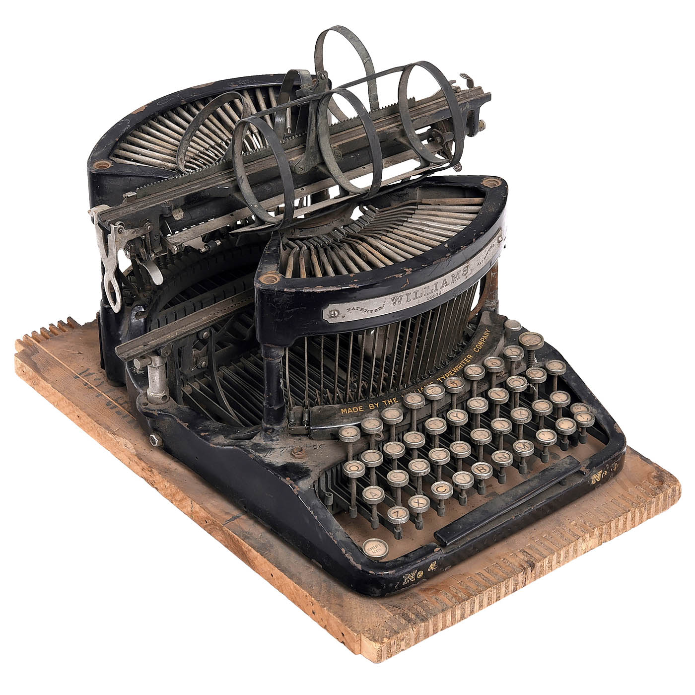 1) "National 1A", 1889, low serial no. 1424, rare American upstroke machine by Hermann Unz from the idea and patents by Franz Xaver Wagner, New York City, with round Ideal keyboard, frame at the rear broken, loose carriage enclosed. – One of the great typewriter inventions! – And: 2) "Williams No. 4", c. 1900, attractive American "Grasshopper" typewriter, serial no. 21611, missing parts, loose carriage enclosed. – Literature: Martin, 1949, p. 128. – Both in need of restoration.