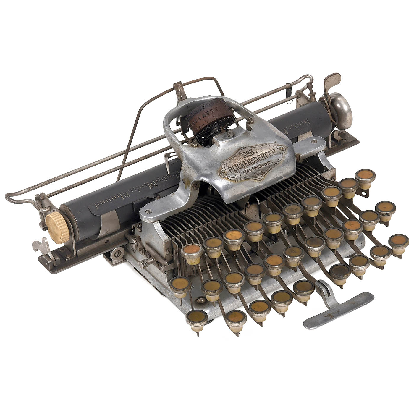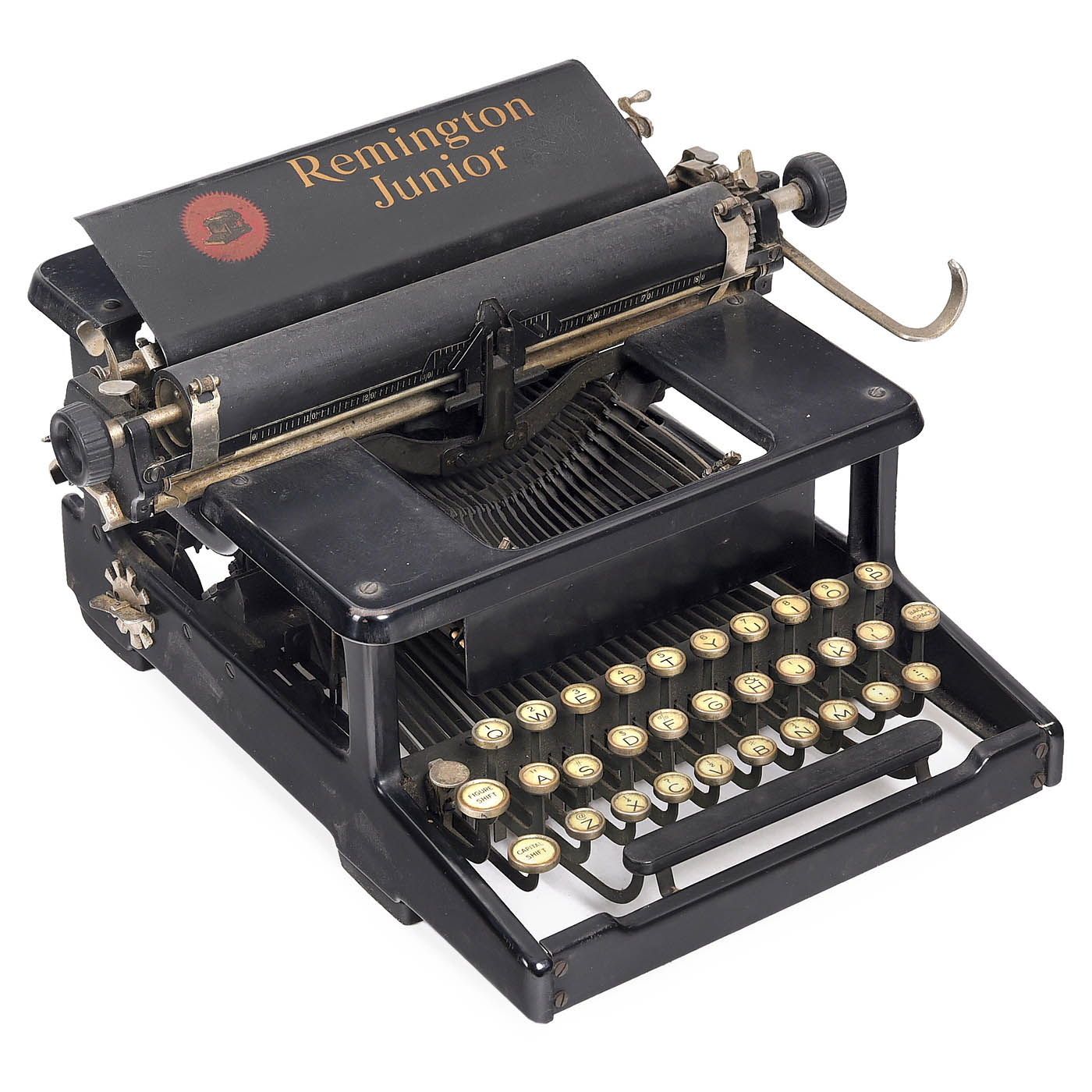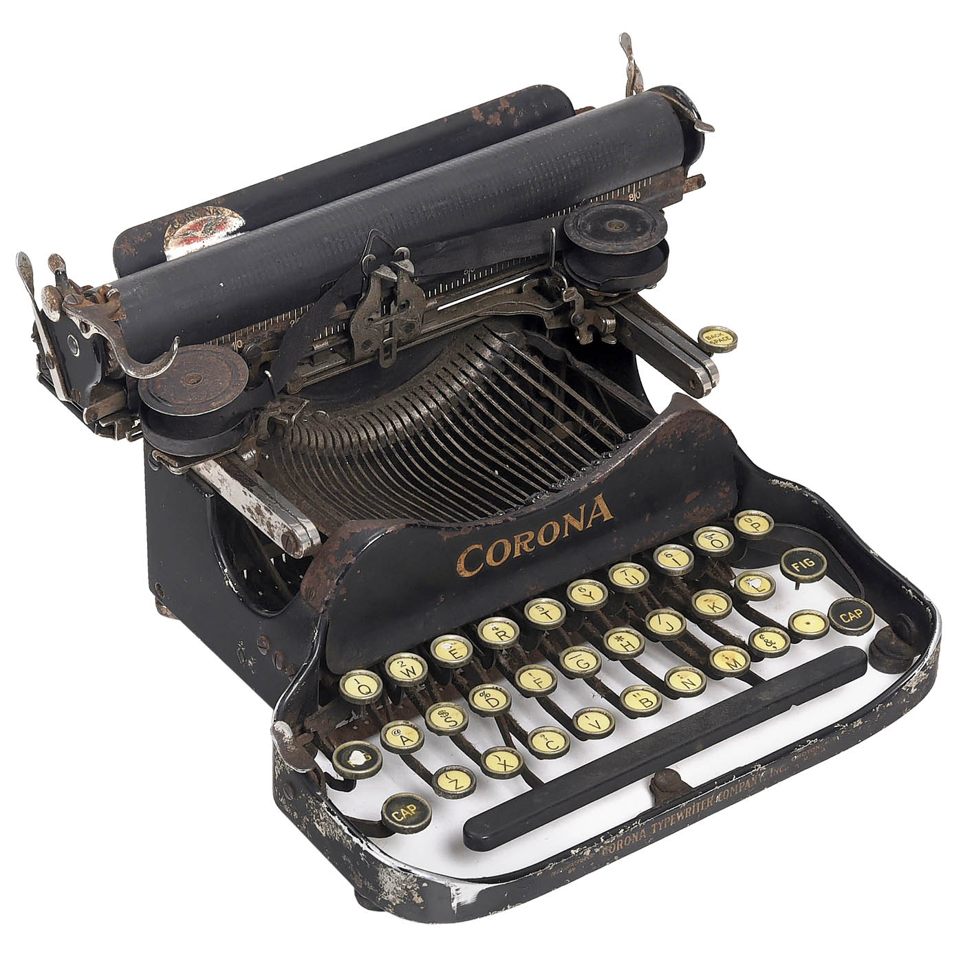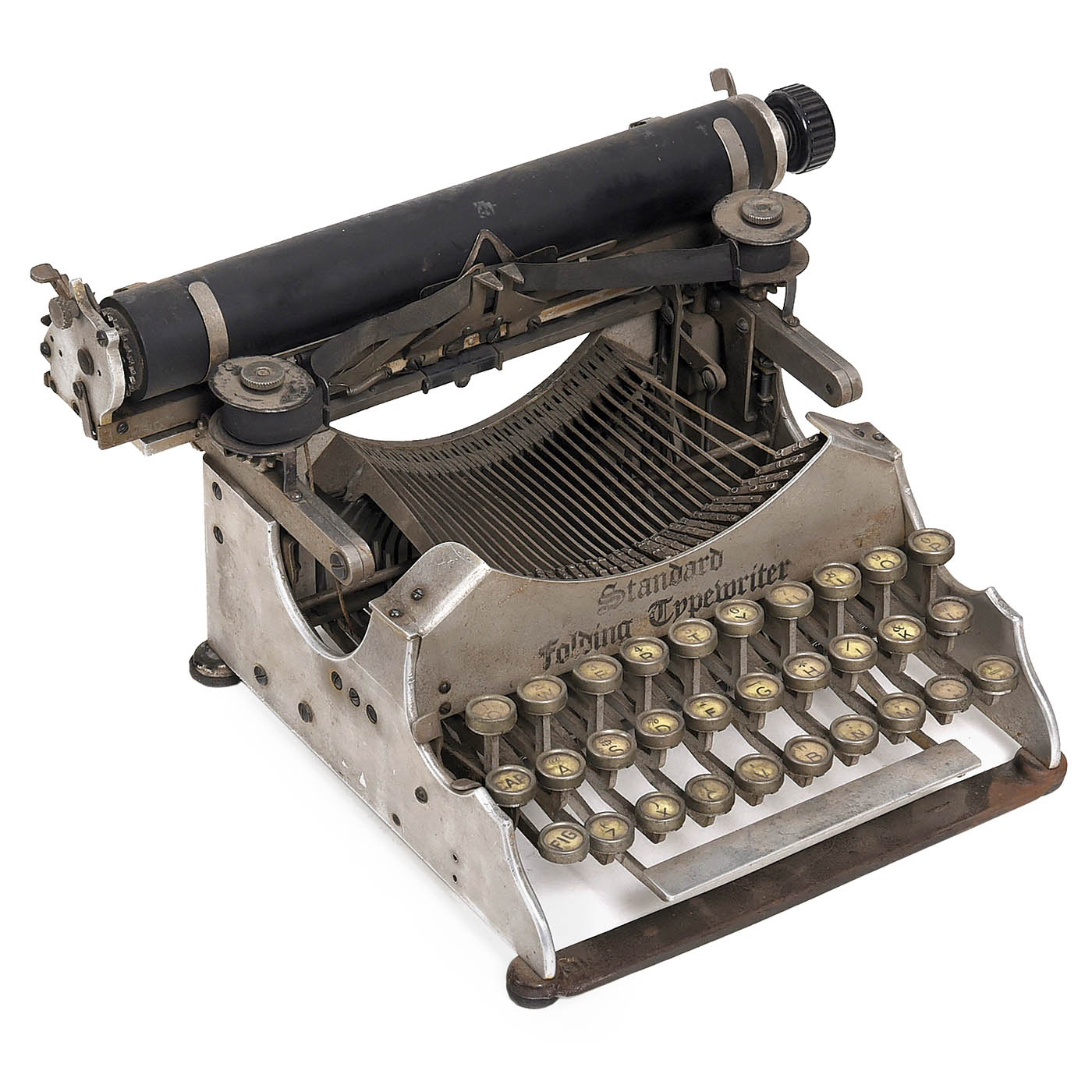 1) "Remington Junior", 1917, 3-row frontstroke machine, carriage movement defective. – 2) "Corona Folding No. 3", c. 1925, platen and carriage can fold down to rest on the keyboard, somewhat rusty, missing some screws. – 3) Standard Folding Typewriter model 2, 1910 onwards, no. 5821, aluminum frame and carriage, shift-keys on left side of the keyboard, folding carriage, in need of cleaning, carriage escapement defective. – And: 4) "Blickensderfer No. 5 Aluminum", 1909, serial no. 141659, American portable typewheel machine, ink-roller, downstroke, 28 keys in 3 rows, 2 shift-keys, 84 characters, QWERTY keyboard, mechanism defective. – Note: Invented by George C. Blickensderfer (1850–1917) in 1891 and manufactured by the Blickensderfer Mfg. Co., 385 Broadway, New York, USA. Very few were made.