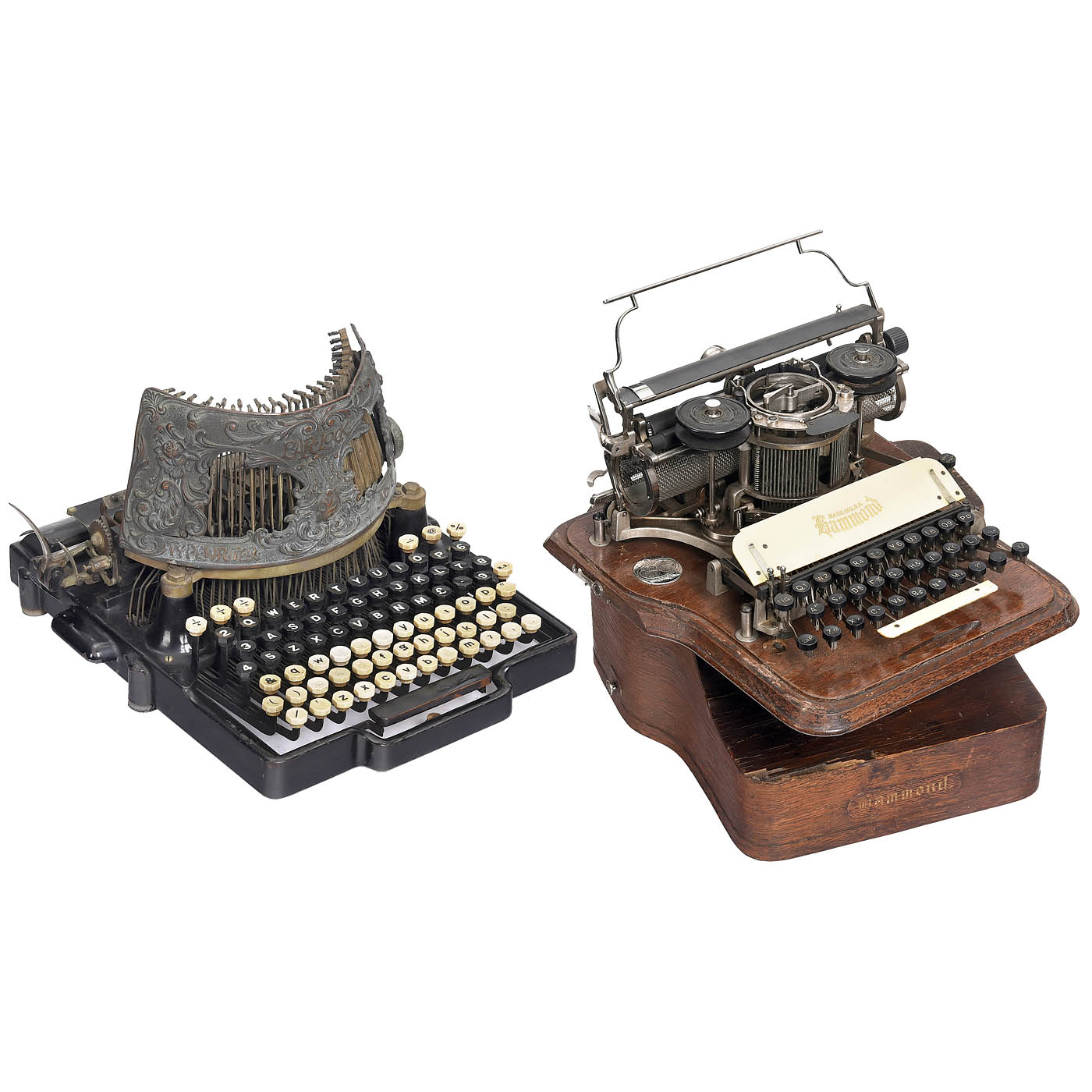 1) "Bar-Lock No. 6", c. 1886, serial no. 32791, Columbia Typewriter Co., New York, invented by Charles Spiro, typebar machine with wonderfully decorative Baroque-styled pressed copper front shield, carriage movement defective. – Literature: Martin, 1949, p. 102. (3/4) – And: 2) "Hammond No. 12 Universal", 1904 onwards, serial no. 70686, early American typewriter with straight universal keyboard of 3 rows and 30 keys, nickel-plated metal mesh paper tube, single-piece type-shuttle, working, with oak base and lid. (2–3/2–3)