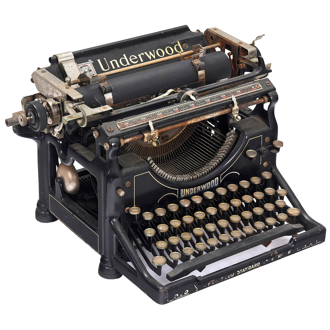 1) "Remington Standard No. 2", 1890, serial no. 91171, American upstroke machine, partially rusty, three typebars broken, carriage movement defective. Successor to the famous Sholes & Glidden, the first successful typewriter in the world. (4/4) – 2) "Underwood Standard No. 5", c. 1920, no. 2496342-5, four-row frontstroke, 84 characters, somewhat dirty and rusty, mechanism stiff. (3–4/3–4) – 3) "Smith Premier No. 2", 1895, serial no. 113175, second model of this popular American upstroke machine with full keyboard and in-built cleaning brush, working. – Literature: Martin, 1949, p. 109. (2–3/2–3) – And: 4) "Oliver No. 9", c. 1919, serial no. 774641, defective, incomplete. (5/5)