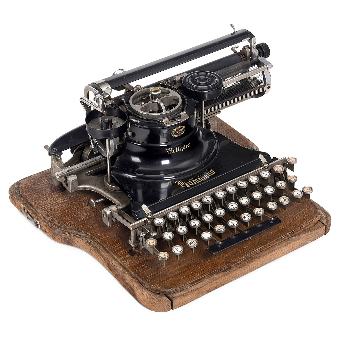 1) "Wellington No. 2", 1892, serial no. 14749, American production of the Canadian "Empire" by Williams Mfg. Co., Plattsburgh, NY, mechanism partially sticking, with tin cover and oak base. – Literature: Martin, 1949, p. 130. (3/4) – 2) "Underwood Standard No. 5", c. 1920, no. 696444, 4-row frontstroke machine, 84 characters, somewhat dirty, working. (3/3) – 3) "Royal Standard No. 5", c. 1910 onwards, serial no. 140190-5, Royal Typewriter Co., New York, flatbed, 4-row frontstroke machine, one typebar broken, otherwise working, in leather case (worn). (3/4) – And: 4) "Hammond Multiplex", c. 1920, serial no. 212650, closed version, American type-sleeve machine with straight universal keyboard, mechanism sticking. (3+/4)