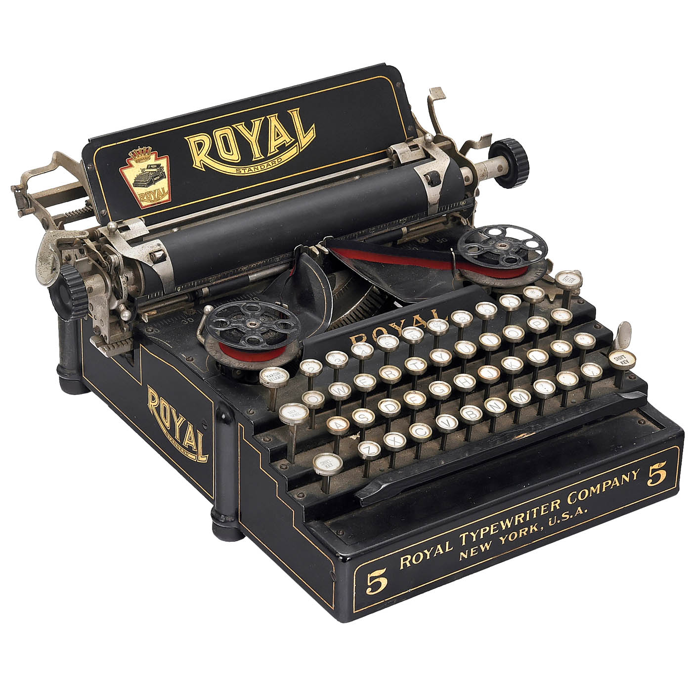 1) "Remington Standard No. 3", c. 1879, serial no. 3646, extra-wide carriage, upstroke machine, wood typebars, carriage movement defective. – Literature: Martin, 1949, p. 67. – A very rare model. (3/4) – 2) "Royal Standard No. 5", c. 1910 onwards, serial no. 100459-5, Royal Typewriter Co., New York, four-row frontstroke machine, working, mechanism somewhat stiff, in need of cleaning. (2–3/3) – 3) "Underwood Standard No. 2", c. 1902, no. 13606-2, four-row frontstroke machine, mechanism clumsily repaired, carriage defective. (3/4) – And: 4) "Oliver No. 5", 1912, serial no. 268429, popular American frontstroke machine, working. (3+/3+)