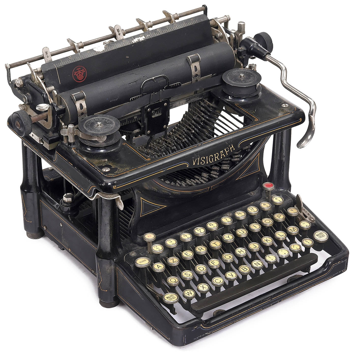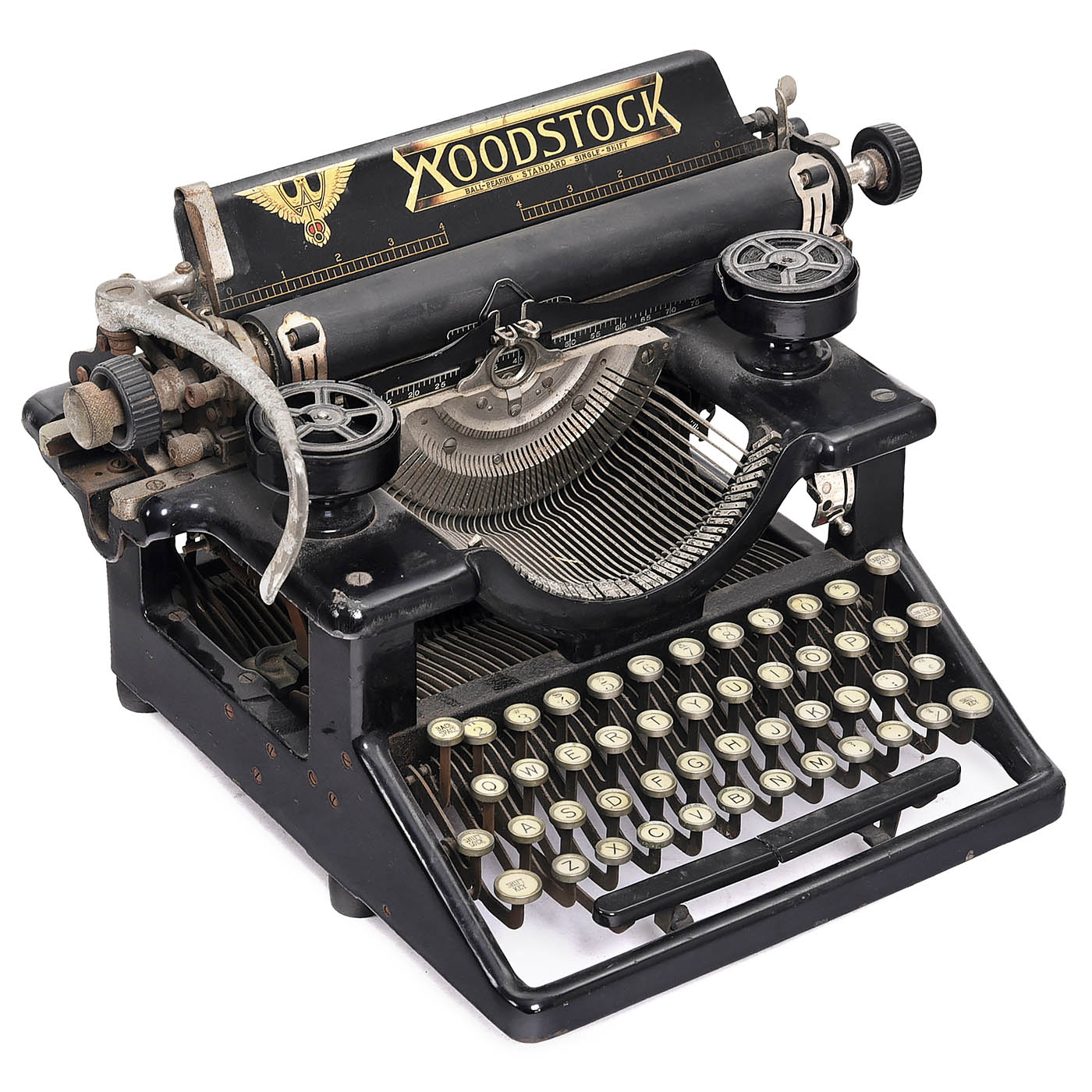 1) "Visigraph", 1910, serial no. 10510, frontstroke machine, single-shift 4-row AZERTY-keyboard, design by Charles Spiro, New York, inventor of the Columbia-Index, the Bar-Lock and the Columbia Music Typewriter. – Literature: Martin, 1949, p. 261. – Rare to find. (3/3) – 2) "Fox No. 3", c. 1898, serial no. 10489, 4-row American upstroke machine with swiveling cylinder, invented by William Ross Fox and manufactured by Fox Typewriter Company in Grand Rapids, Michigan, working. (3+/2–3) – 3) "Woodstock Standard Model 5", 1922, serial no. F109449, space-bar broken, carriage movement stiff. (3/4) – And: 4) "Molle No. 3", c. 1918, serial no. 7440, a pleasant and light machine, easy to repair and dismantle in three parts: carriage, keyboard/type-basket and frame, working. – Literature: Martin, 1949, p. 281. (2–3/2–3)