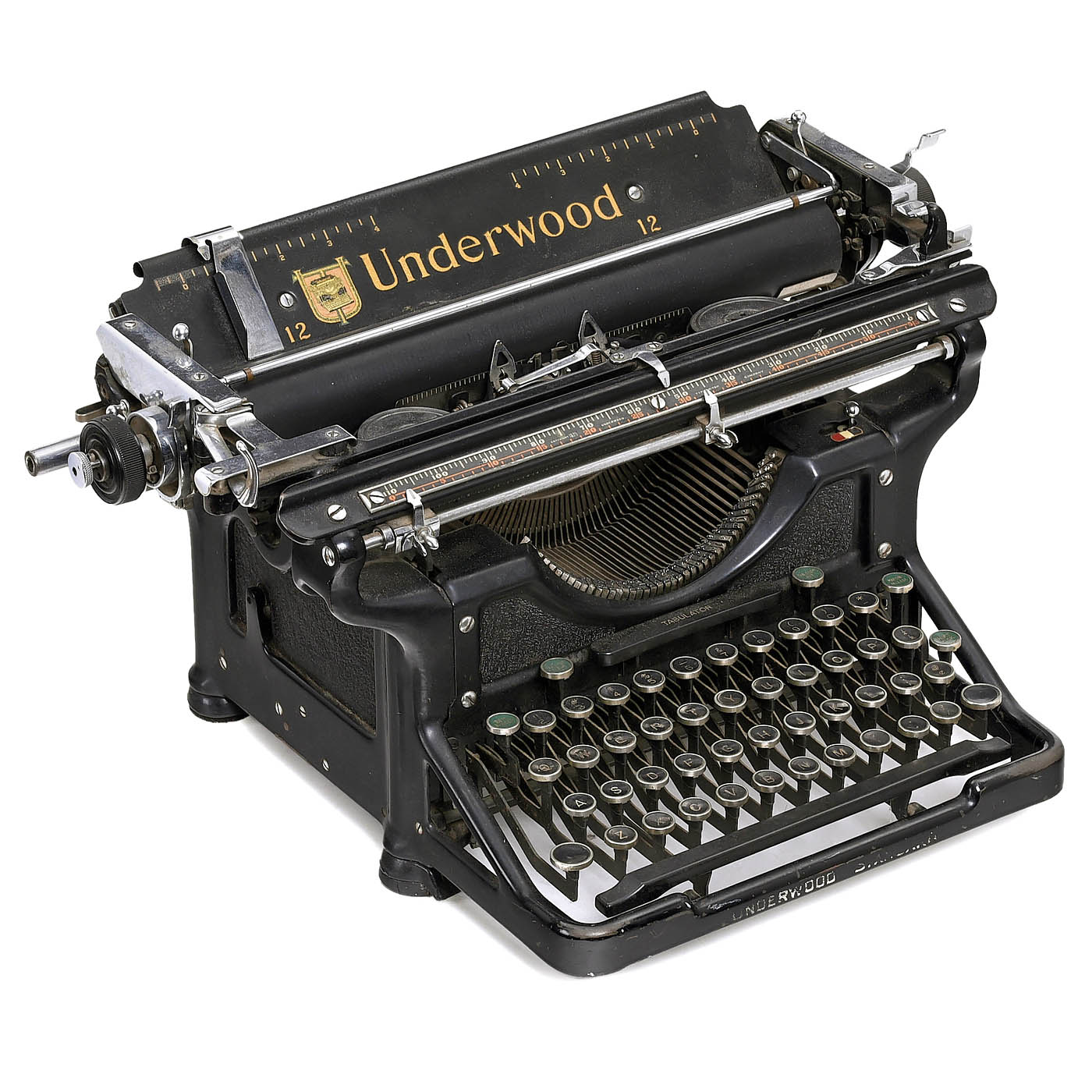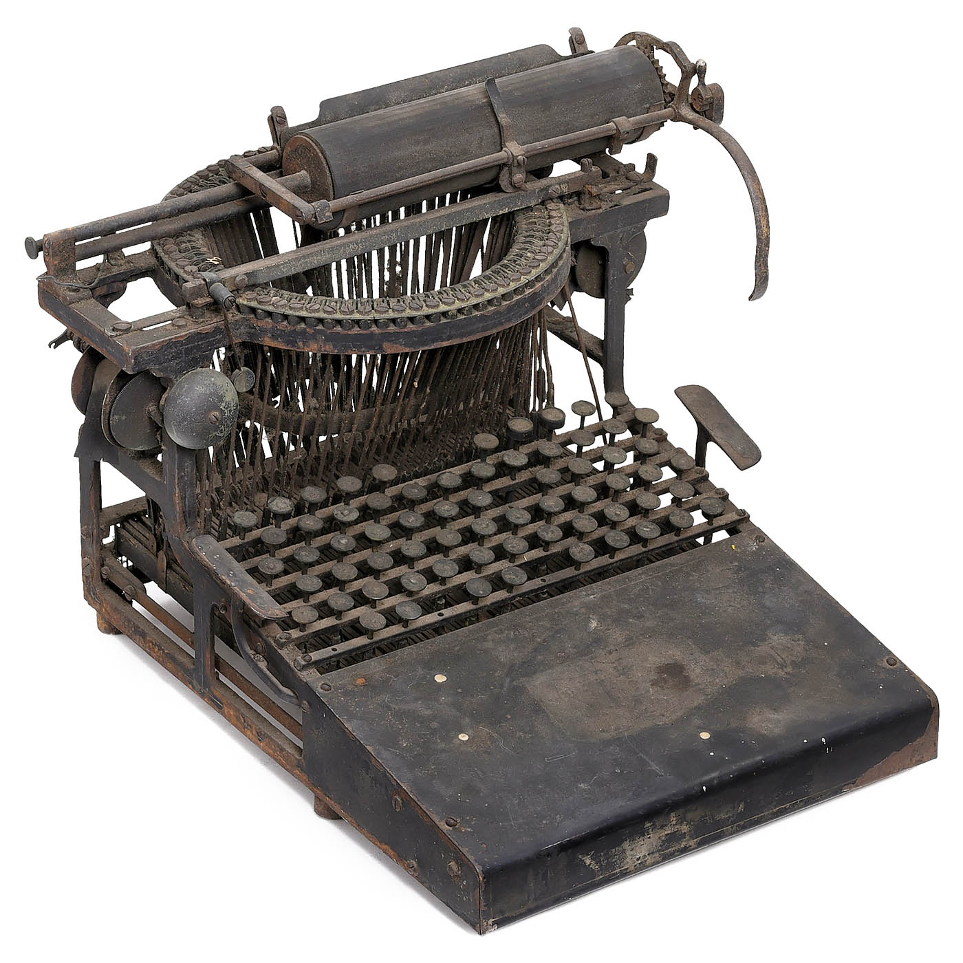 1) "Remington Standard No. 2", c. 1899, no. 08545, upstroke, 38 keys, missing wood roller, carriage movement defective. (3/4) – 2) "Underwood Standard", c. 1930, four-row frontstroke machine, 84 characters, 12-inch carriage, working. (3/3) – 3) "The Caligraph No. 2", 1882 onwards, serial no. 4702, upstroke machine with full keyboard, shift-keys on both sides, 72 characters in 6 rows, very dirty, partially rusty, missing 6 keys, defective. (5/5) – And: 4) "Oliver No. 11", c. 1923, carriage movement defective. (3/4)
