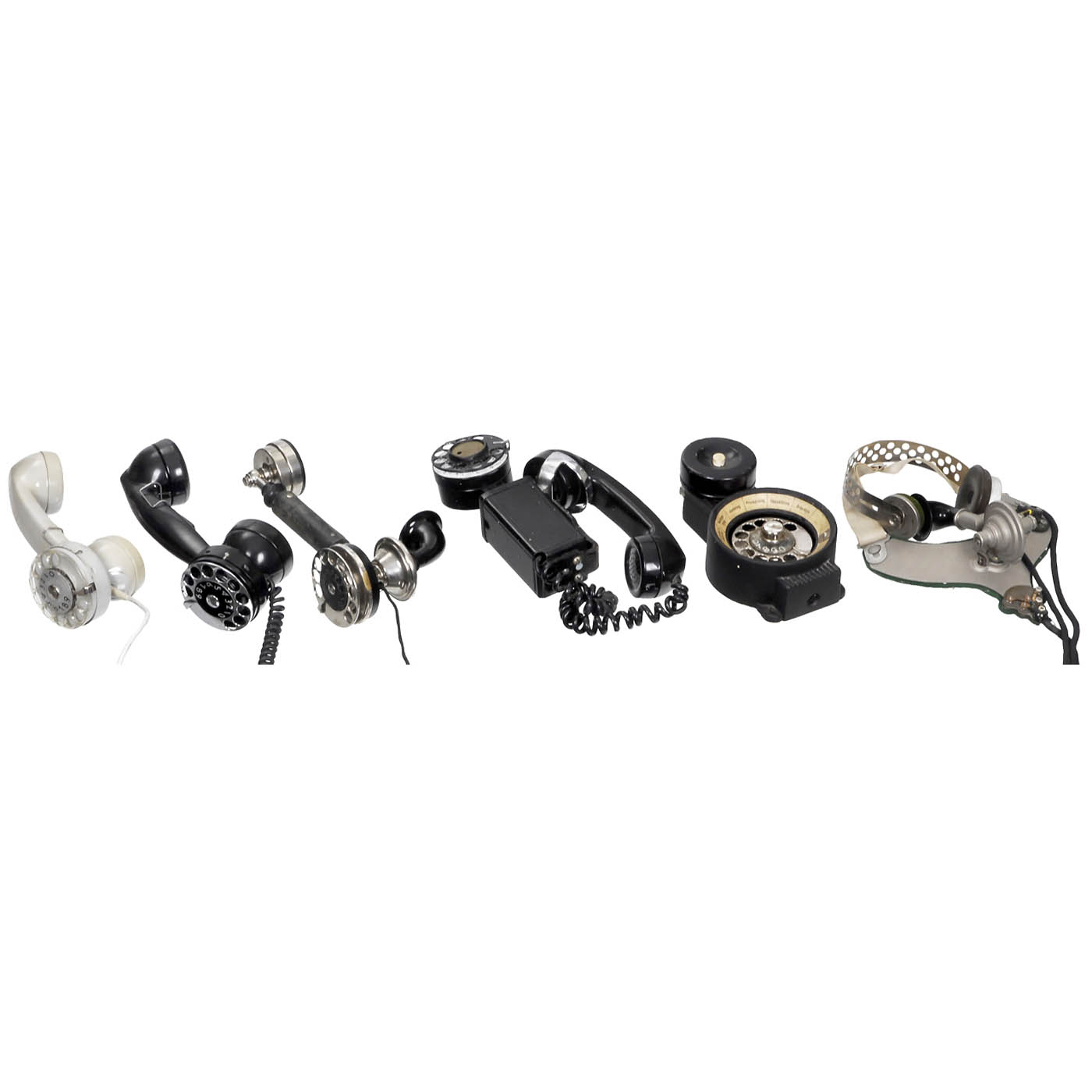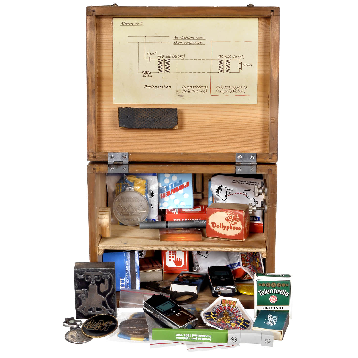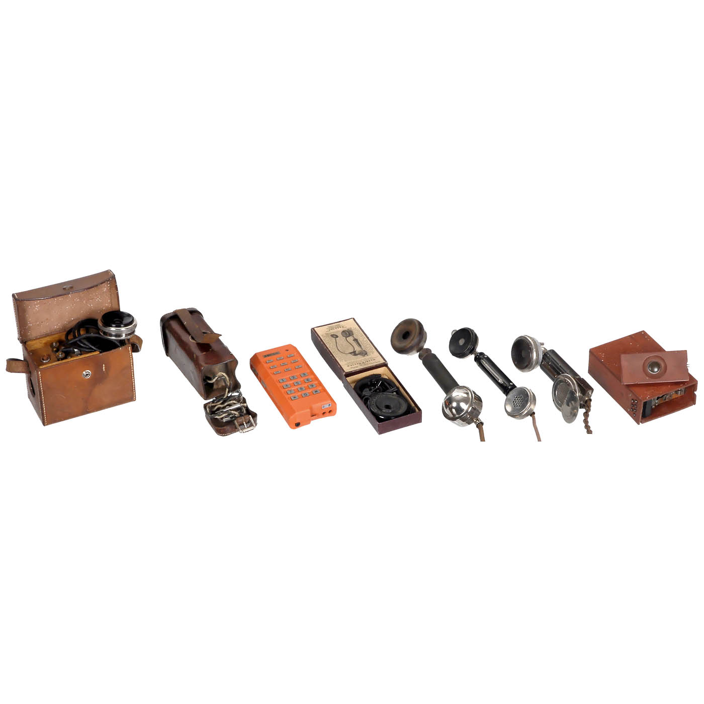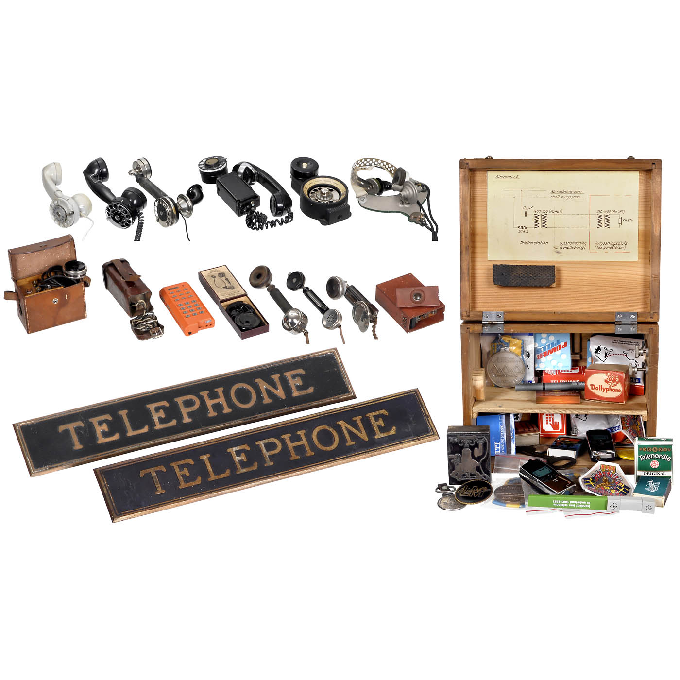 1) 4 handsets with dials. – 2) A chest microphone with headphones from Ericsson. – 3) A line tester with dial from Ericsson. – 4) Handset for testing purposes, in leather case. – 5) Battery, in leather belt pouch. – 6) Harris test telephone, with keypad. – 7) Three handsets, one for an Ericsson field telephone. – 8) Telephone amplifier "Polyfon", with instructions in original box. – 9) Box with various souvenir items. – 10) 2 brass signs "Telephone". – And: 11) Other parts.