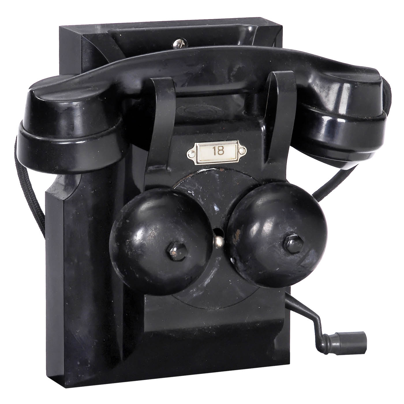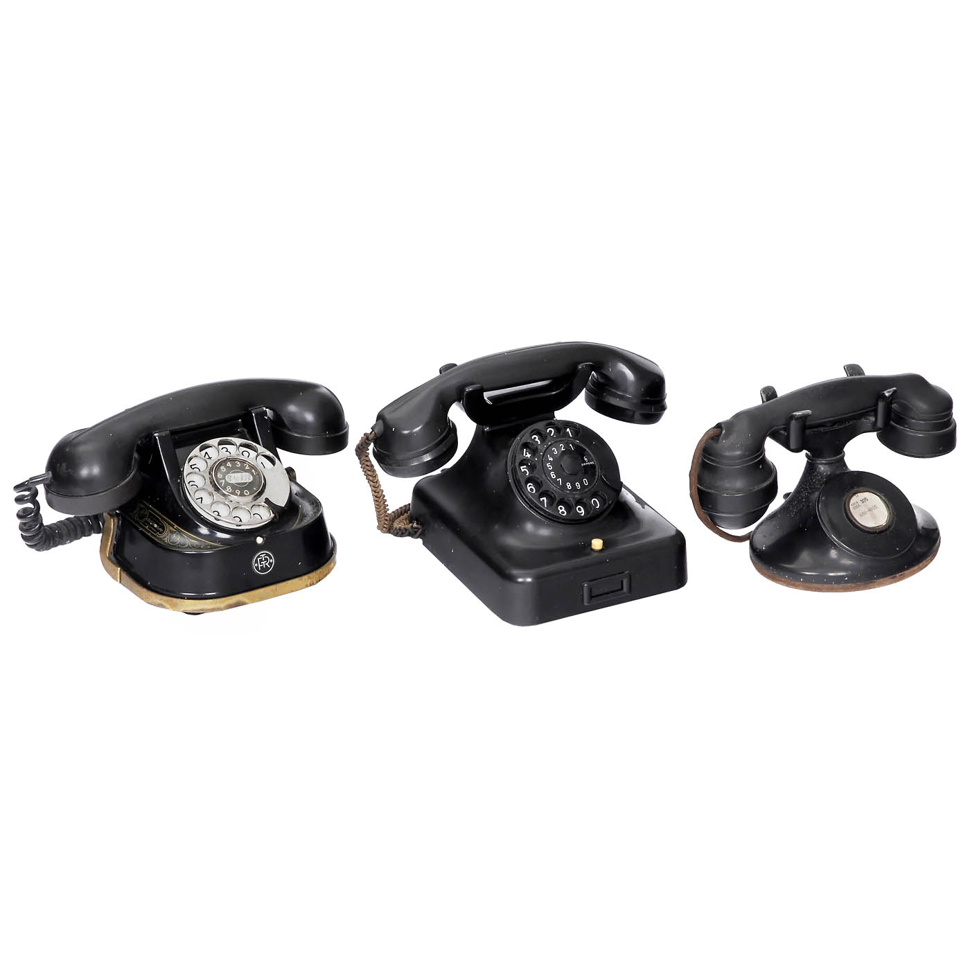 1) Swedish Televerket coin-operated telephone, green metal case, dial, bakelite receiver. – 2) Wall telephone, L.M. Ericsson, bakelite case and receiver, crank inductor, double bell. – 3) 2 FTR table telephones, Bell Telephone, Belgium, metal case, bakelite receiver, dial. – 4) Intercom telephone, probably England, bakelite receiver, metal case. – 5) Company telephone, Germany, for 10 connections, with dial. – 6) Wall-mounted telephone, Western Electric, USA, metal case, speaking horn, Bell-type bakelite receiver, wiring not complete. – 7) Desk telephone, Siemens & Halske, green-lacquered metal case with floral motifs, dial, double bell, handset with hygienic microphone. – 8) Desk telephone, RTT 56, Belgium, copper case, dial, bakelite receiver. – 9) Desk telephone, Kjøbenhavns Telefon Aktieselskab, red metal case, dial, counter, handset with speaking-in horn. – 10) Desk telephone, PTT, copper case, bakelite receiver, dial, 7 switches. – 11) Desk telephone, Siemens & Halske, bakelite, with dial. – And: 12) Wall telephone, Siemens & Halske, unusual line dialer, dialing with rotary switch, metal case, bakelite receiver, rare.
