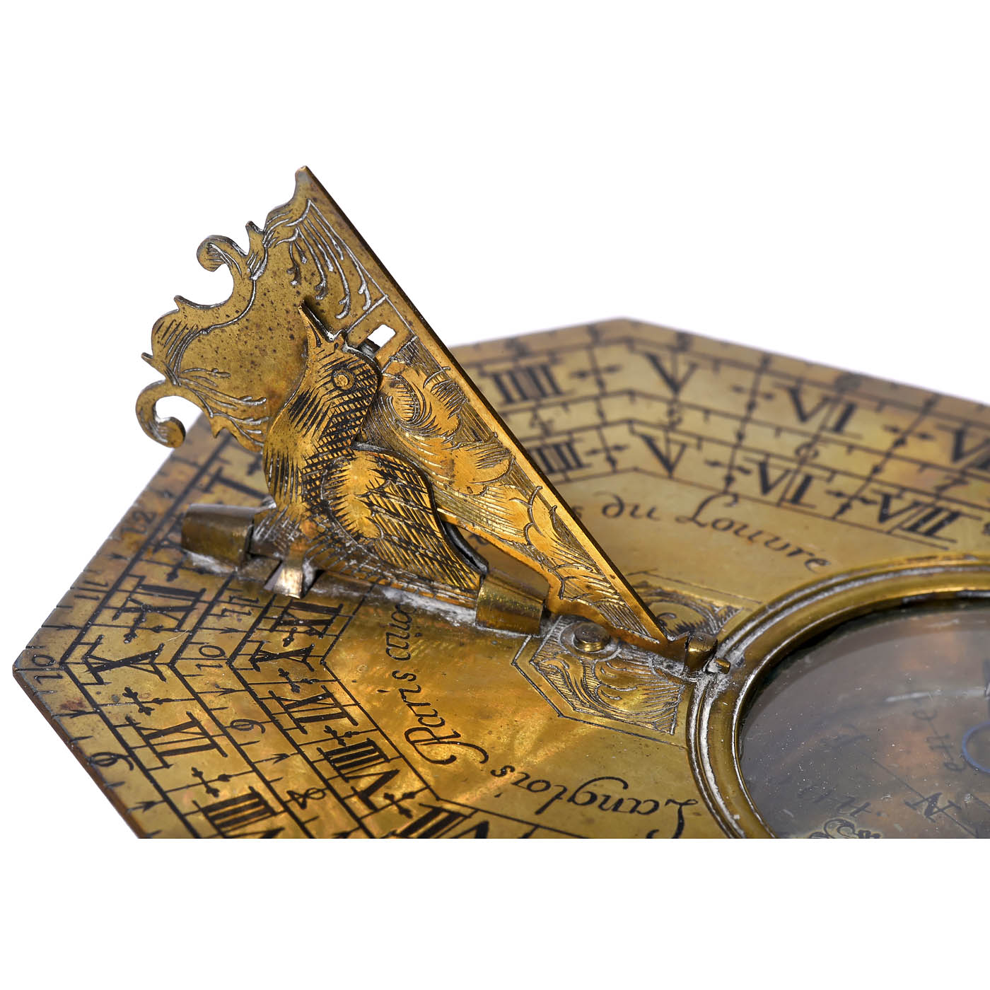Signed "Langlois Paris, Galeries du Louvre", hand-engraved octagonal brass plate, glazed inset compass, Ø 1 1/10 in., blued magnetic needle, hinged gnomon with adjustable angle, latitude scale from 40º to 60º, index in the shape of a bird, the beak serving as a pointer, dial engraved with four different hour scales, alternating Roman and Arabic numerals for latitudes 43, 46, 49 and 52, back of baseplate engraved with names and latitudes of several French and other European cities, in original fruitwood case, inside lined with red velvet, outside covered with leather (incomplete), dimensions of baseplate 2 ¼ x 2 ½ in., sundial in good working original condition.