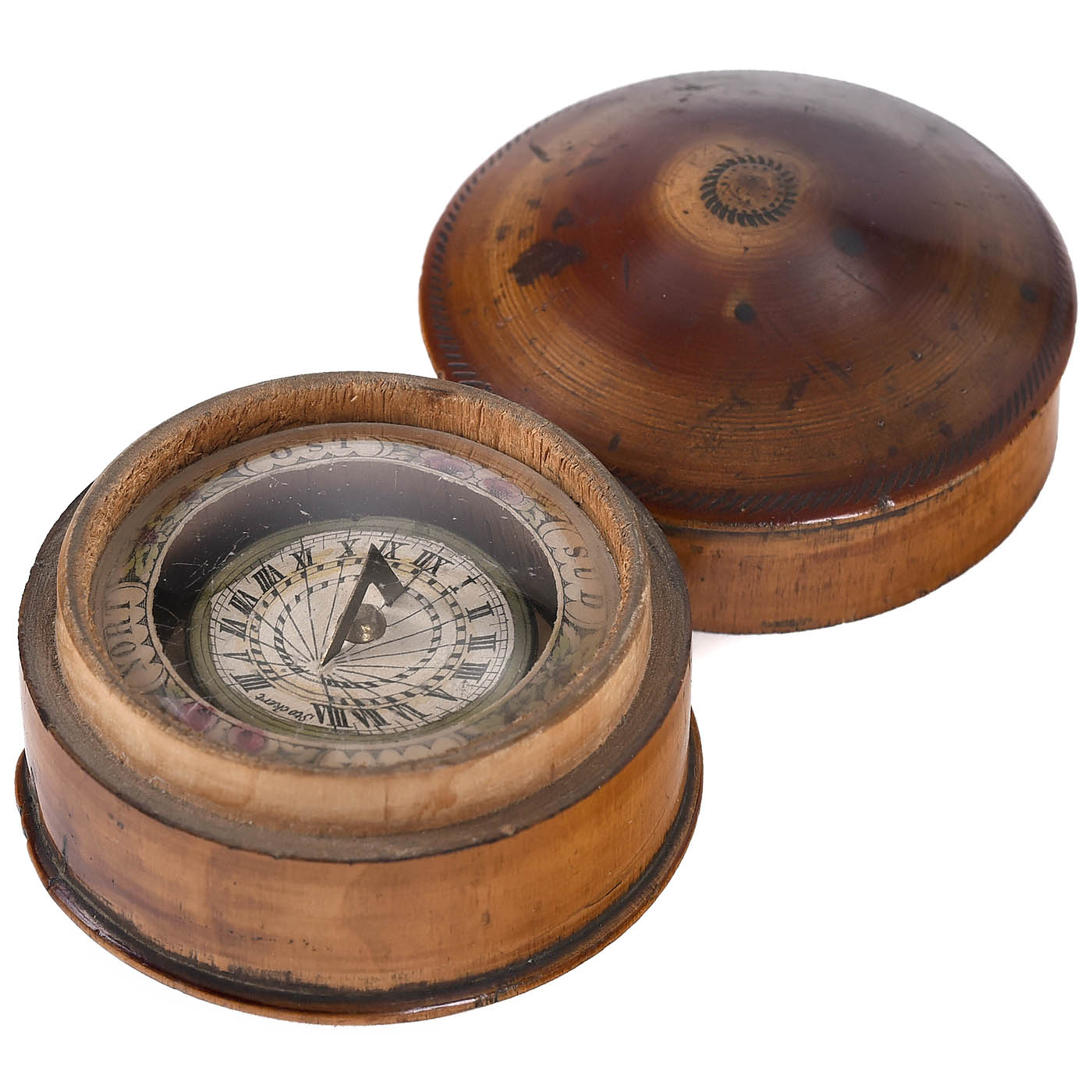Johann Paul Stockert, Nuremberg. Pantochronometer with floating circular printed paper dial and gnomon, floral-lithographed and hand-colored compass ring with Roman numerals, automatically adjusting to the north-south line, printed credit "Stockert" at south, under domed glass cover, in turned fruitwood case with lid, Ø 2 ¼ in., small chip at the lower edge, working.
