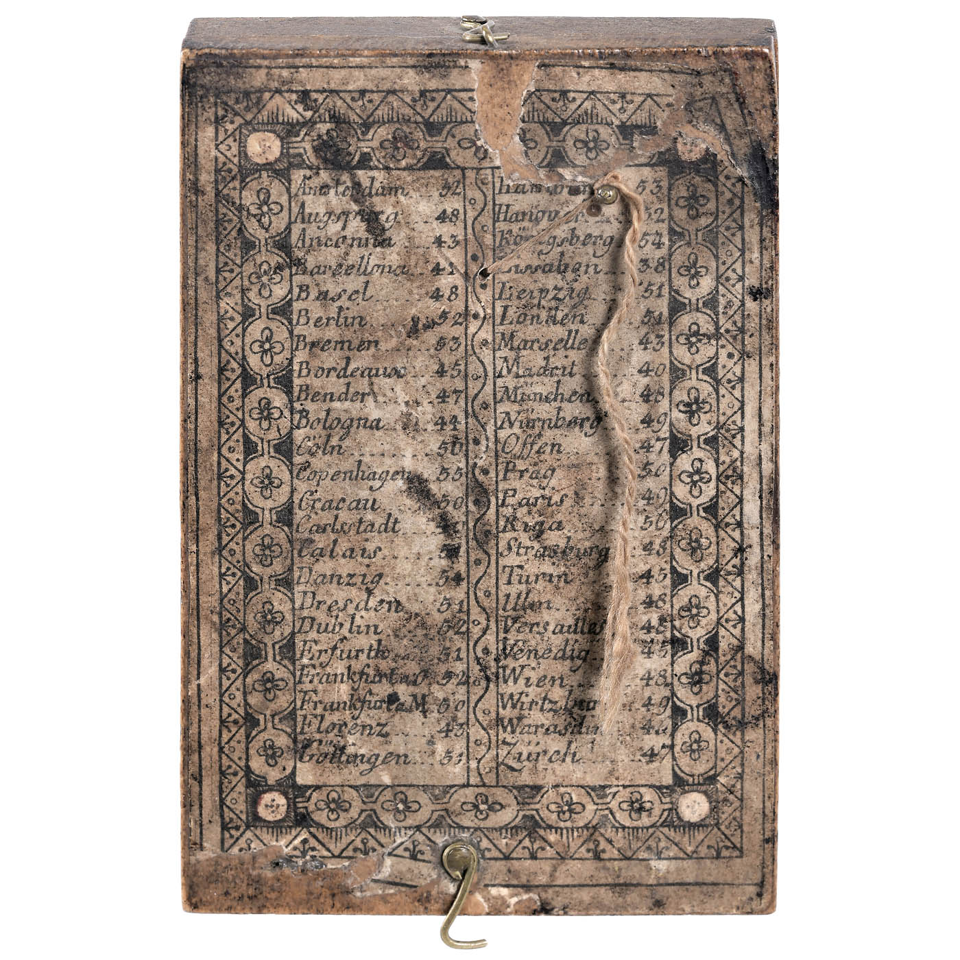 Marked on the compass card: "J.P. Kleininger" (Johann Paul Kleininger, Fürth), hand-colored copper engraving on two-piece fruitwood body, string gnomon, inset compass, reverse with list of European cities and their latitudes in alphabetical order, dimensions folded 2 ½ x 3 ¾ x 3/5 in.