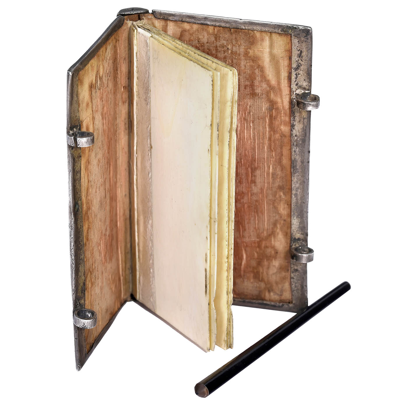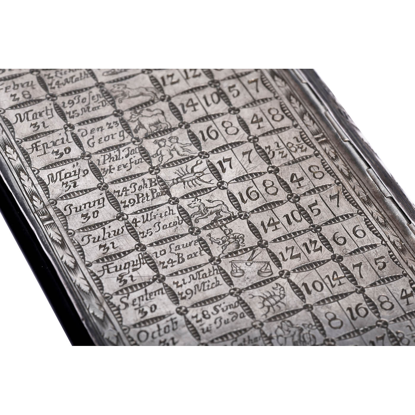 Book-form silver case with four bound-in rectangular tablets for the notes, the front engraved with fine Rocaille motifs, flowers and two birds, the center set with a revolving disc calendar for day and date (of the month), the back with a list of the months, the most important festivals, engraved drawings of the signs of the zodiac, the length of day and night and the rising and setting of the sun, pen added, 2 ½ x 4 ¼ in.