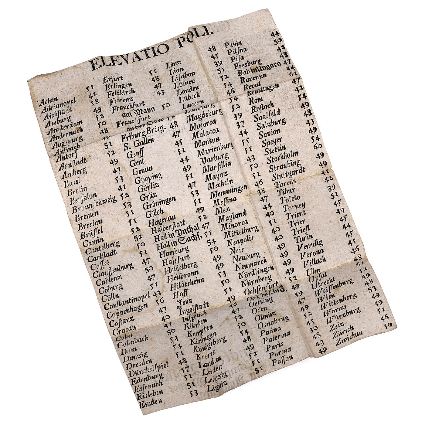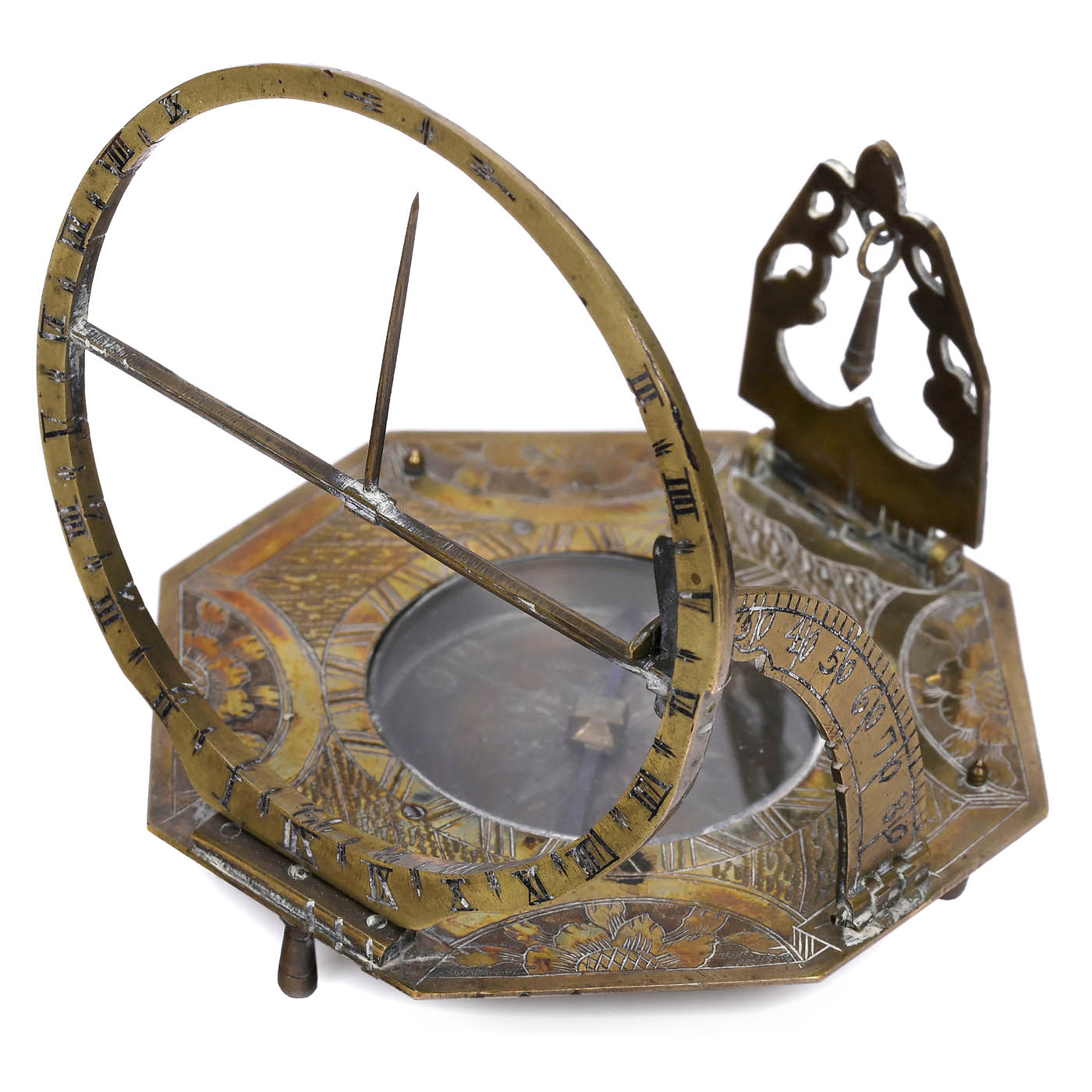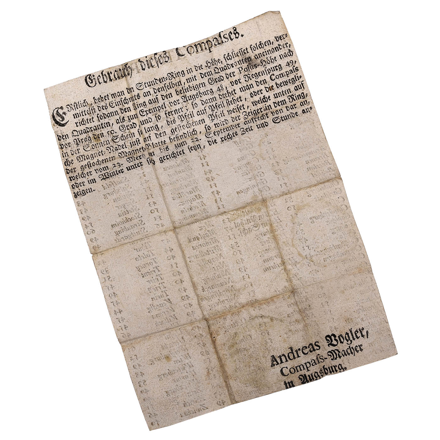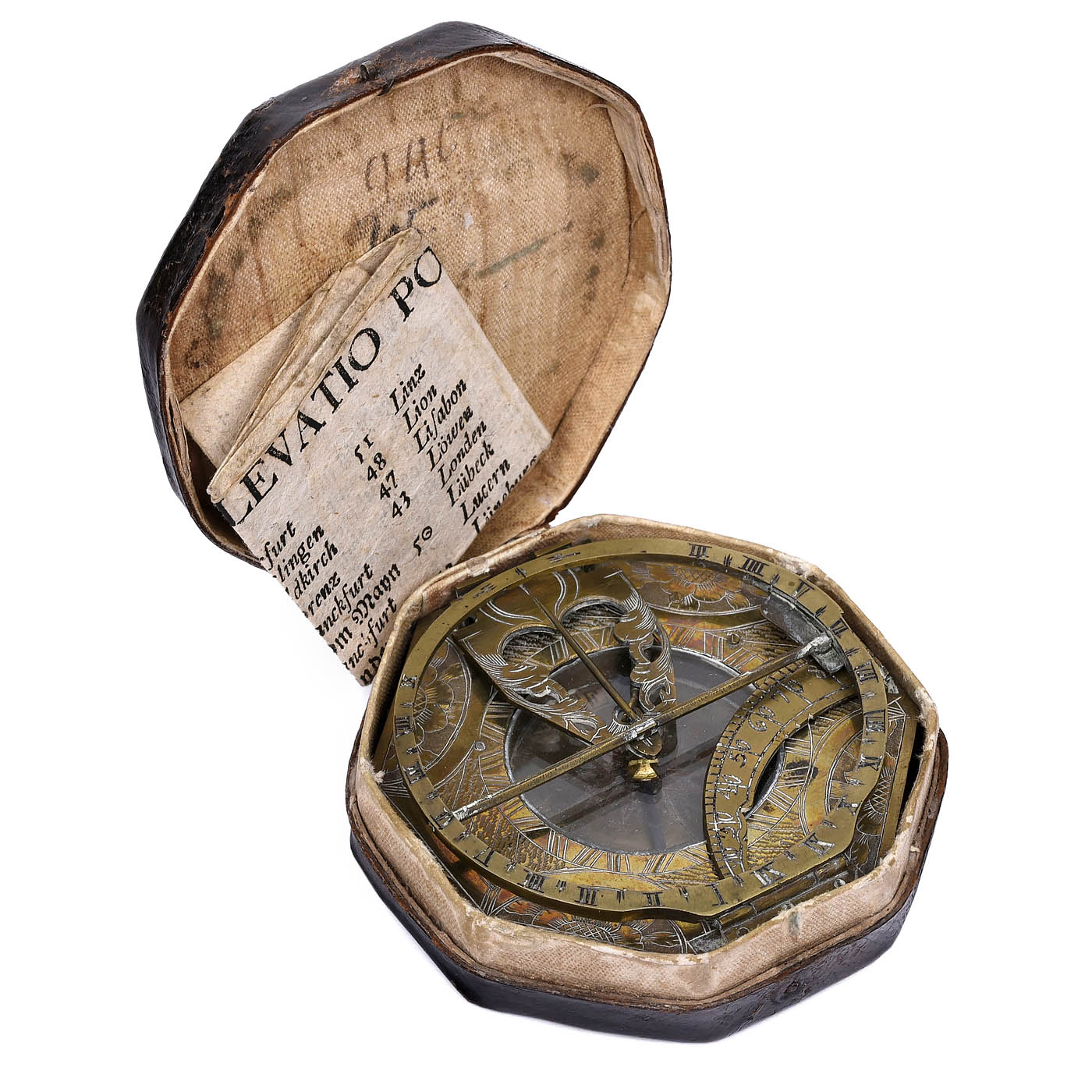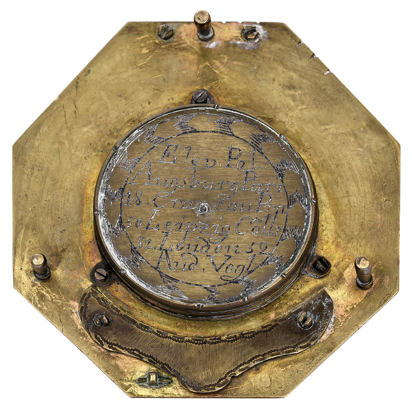 Finely engraved octagonal brass body on pin feet, glazed compass with blued-steel needle, hinged hour ring and polar height quadrant, inset plumb, reverse engraved "Elevatio Poli Augsburg Paris 48 Cracau Prag 50, Leipzig Coeln 51, London 52, And. Vogl", hour ring engraved with Roman numerals, Ø 2 ¾ in., in original leather-covered pasteboard box, with original instruction and Elevatio Poli list.