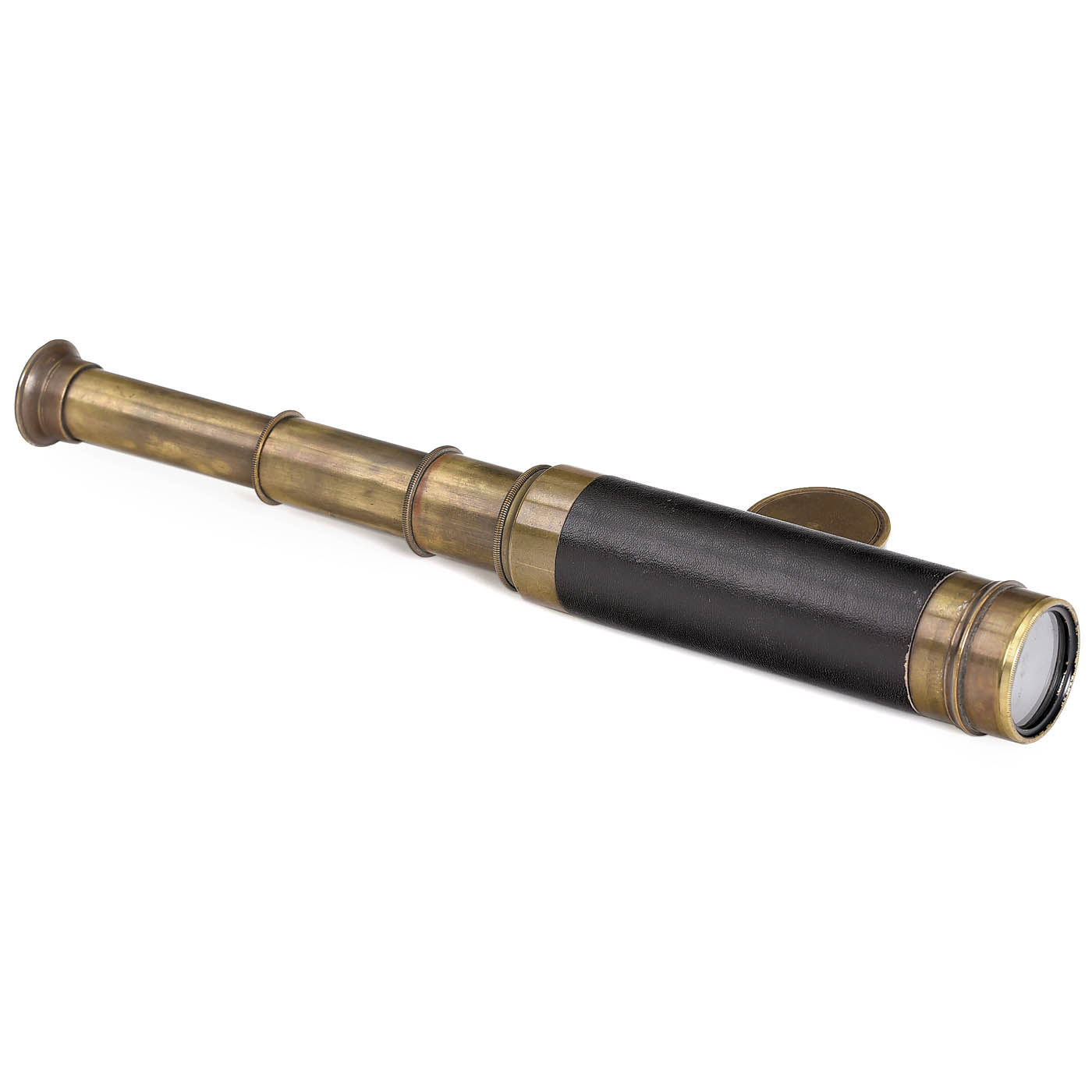 1) Microscope, c. 1850, signed "G. Oberhäuser, Place Dauphine, Paris" (early address), lacquered brass, with typical "Oberhäuser" fine adjustment knob behind the stage, objective, ocular, bull's eye magnifier, single mirror, height approx. 10 in. – And: 2) 3-draw telescope, c. 1900, leather-covered tube, with dust protection cap, length extended 17 in.