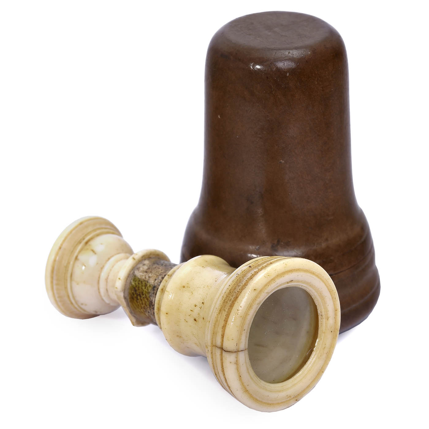 Turned bone, single-draw, approx. double magnification, length retracted only 1 3/5 in., in turned fruitwood case with threaded lid, minor losses on the tube, clear optics.