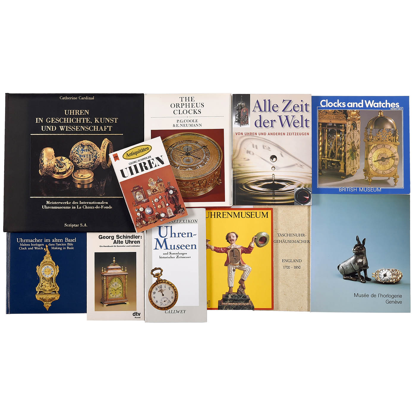 1) "The Orpheus Clocks", London 1972, P.G. Coole & E. Neumann, 164 pages. – 2) "Alle Zeit der Welt", German Chronometric Society 2002, exhibition catalog, 296 pages. – 3) "Uhren in Geschichte, Kunst und Wissenschaft", Bern 1983, Catherine Cardinal, 130 pages. – 4) "Clocks and Watches", England 1983, Hugh Tait, British Museum, 72 pages. – 5) "Uhrmacher im alten Basel", Basel 1986, 128 pages. – 6) "Uhren-Museen und Sammlungen historischer Zeitmesser", Callwey, Munich 1982, Christian Pfeiffer-Belli, 160 pages. – 7) "Pocket Watch Case Makers, England 1700–1850", booklet, 20 pages. – 8) "Uhrenmuseum Wien", 1979, catalog, 64 pages, 47 illustrations. – 9) "Alte Uhren", Georg Schindler, Munich 1981, DTV, 220 pages. – And: 10) "Musée de l'horlogerie Genève", 1990, catalog, 88 pages.
