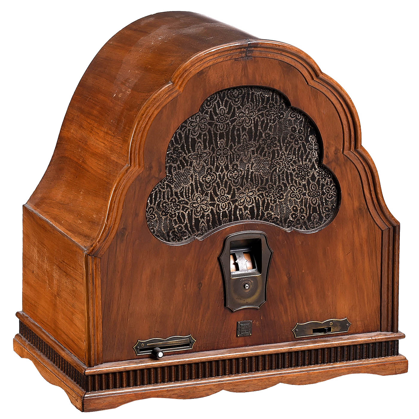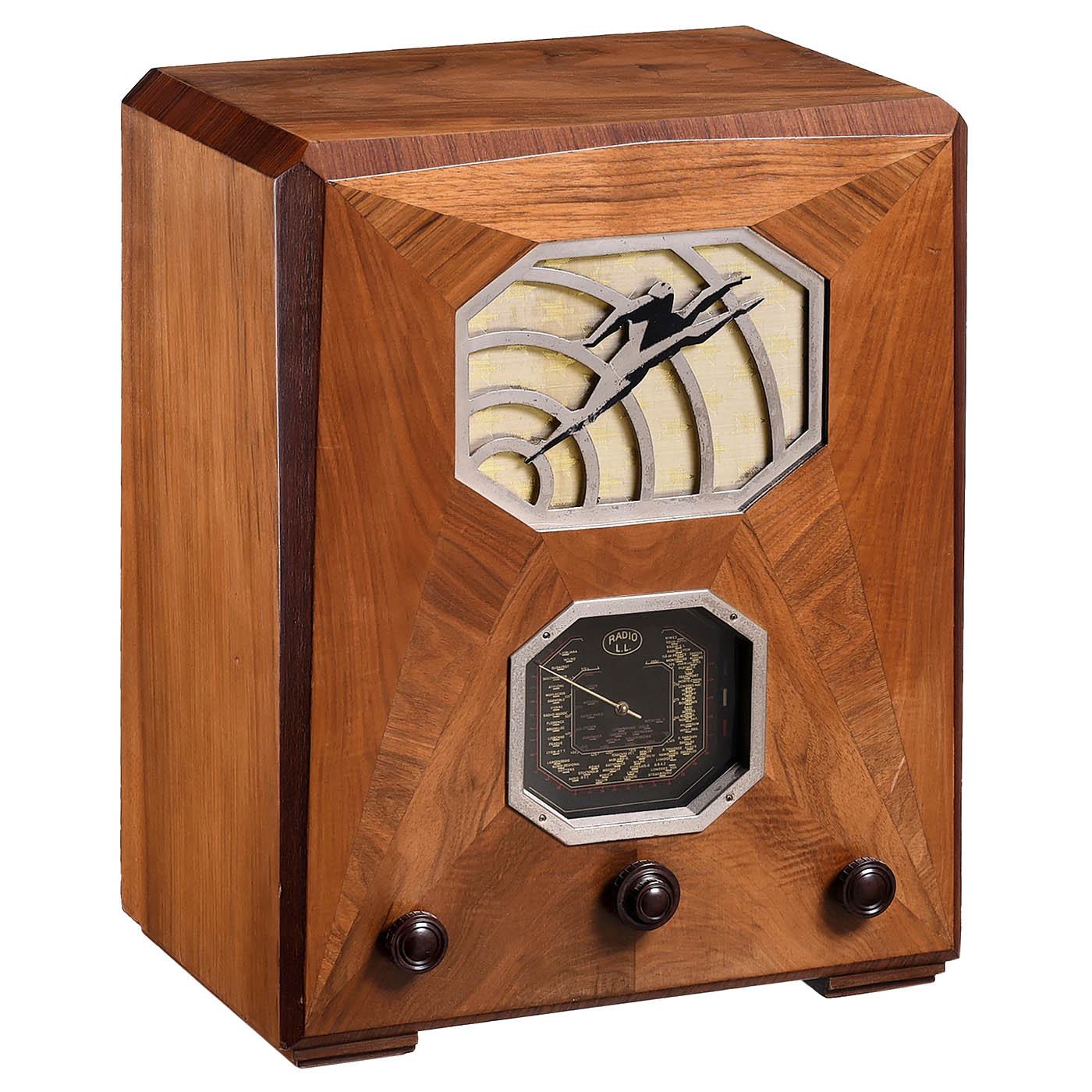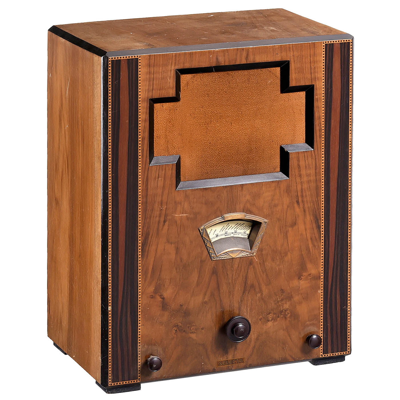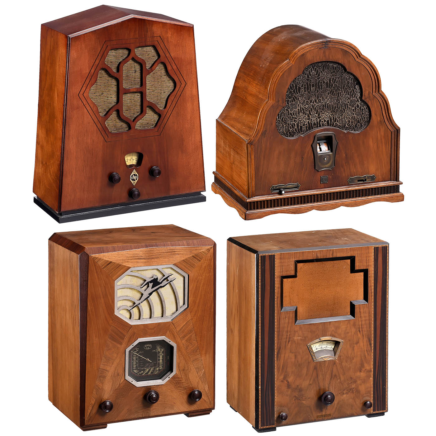 1) Telefunken 342 WL, c. 1932, Milan, Italy, 5 tubes, medium wave only, mains operation, built-in loudspeaker, wood "cathedral" case, complete with tubes and rear panel, rotary knob missing, a rare radio. – 2) Synchrovox 636A, c. 1935, Radio L.L. (Lucien Levy), Paris, France, 6 tubes, 3 wavebands, 110–250 volts AC, dynamic loudspeaker, wood case, loudspeaker cover with jumping gazelle, with tubes but without rear panel. – 3) Selecta, model and functionality unknown, complete with tubes. – And: 4) Super Inductance S5B, c. 1932, Siera, Belgium, 5 tubes, long wave and medium wave, dynamic loudspeaker, without rear panel, with tubes.