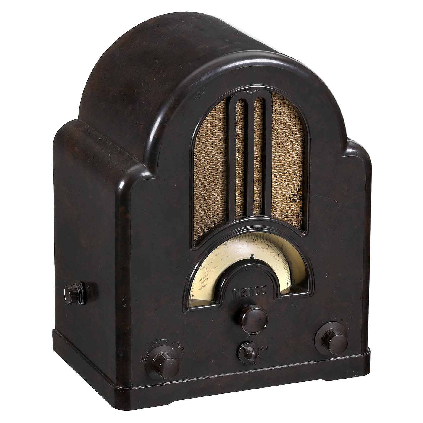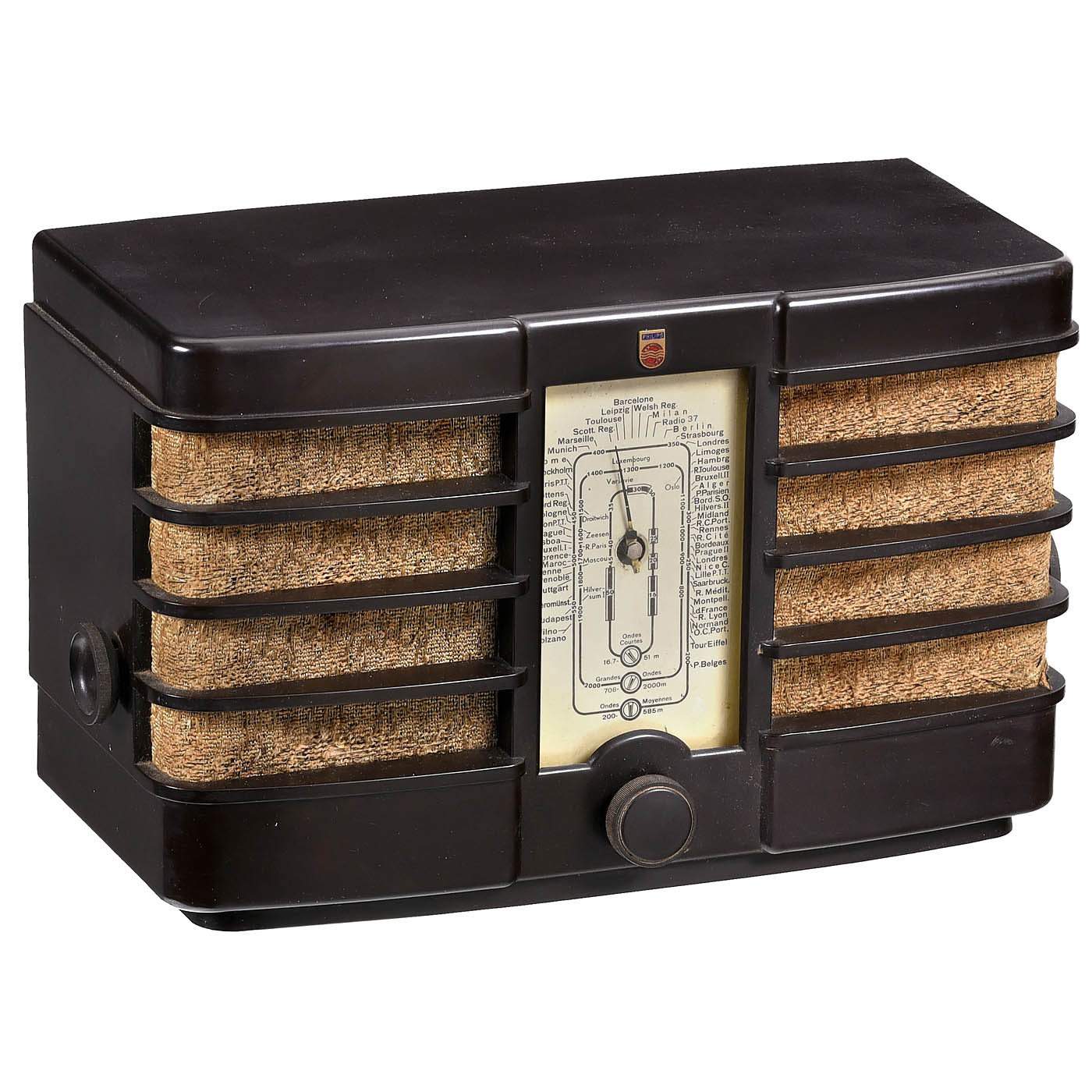 1) ORA S537, Oradyne, Gérard & Cie, Paris, c. 1935, 5 tubes, 3 wavebands, 110–240 volts AC, dynamic loudspeaker, complete with tubes and rear panel. – 2) Loisirs 461A, Philips, France, c. 1937, 5 tubes, 3 wavebands, 103–253 volts AC, dynamic loudspeaker, with tubes, without rear panel. – 3) Philips, France, c. 1950, complete with tubes and rear panel. – 4) Philips BX370U, Netherlands, 1948, 5 tubes, 3 wavebands, universal current, dynamic loudspeaker, complete with tubes and rear panel. – 5) Telefunken 300, Radiotechna, Prague, 1933, 4 tubes, long wave and medium wave, 110–240 volts AC, dynamic loudspeaker, with tubes, without back panel. – 6) Philips 215HU, Netherlands, 1939, 4 tubes, 3 wavebands, all currents, dynamic loudspeaker, complete with tubes and rear panel. – 7) Philips 470A, France, 1938, 4 tubes, 3 wavebands, alternating current, dynamic loudspeaker, complete with tubes and rear panel. – And: 8) Europaklasse EK, Radio H. Mende & Co. GmbH, Dresden, 1933, 3 tubes, 3 wavebands, 110–240 volts alternating current, dynamic loudspeaker, complete with tubes and rear panel.
