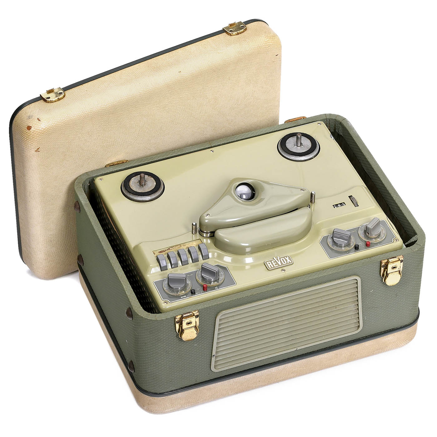 1) Sony Stereo Music Control Centre TC-630, 1968 onwards, Japan, reel-to-reel tape with built-in amplifier with high-quality Sony silicon transistors, 3 sound heads, high-performance speakers in 2 suitcase lids. – 2) Revox E 36, 1961 onwards, Willi Studer, Switzerland, 9 tubes and magic eye EM71, stereo suitcase unit. – And: 3) Unitra TB-2408, 1982 onwards, Zaklady Radiowe, Poland, four-track hi-fi stereo, export unit, were distributed under the name HGS-Elektronik (GDR company). – All untested.
