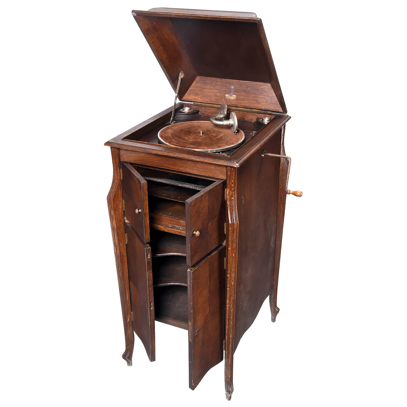 Italy, oak cabinet, front with 4 doors, record compartment, 12-inch turntable, working, dimensions 18 7/8 x 21 2/3 x 42 1/2 in.