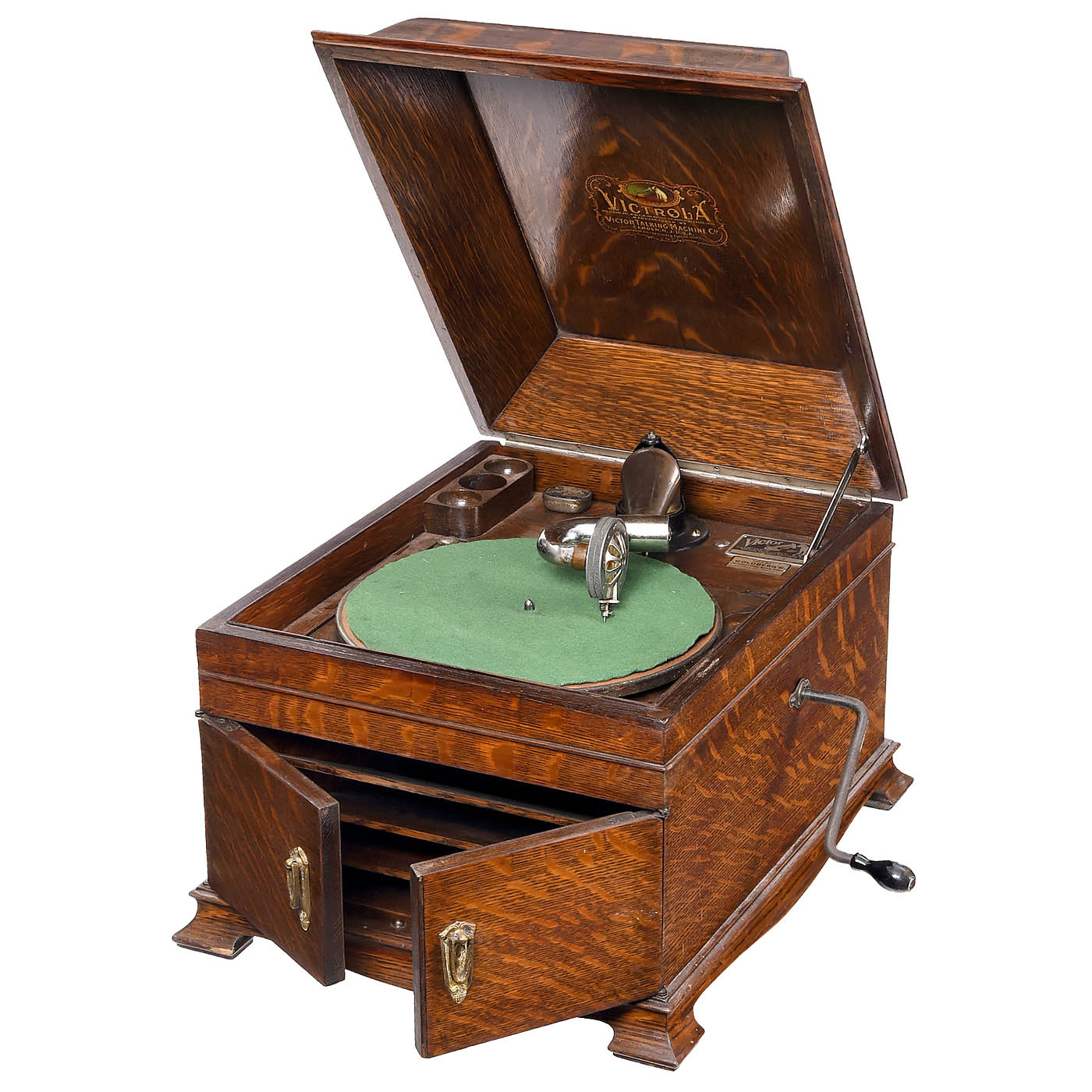 1) Pathéphone Reflex No. 21, c. 1914, Pathé, Paris, for vertically-cut records, reflex horn in lid, Pathé reproducer with sapphire, walnut case, left side with compartment for pick-up arm and crank, excellent playing condition. – And: 2) Victrola VV-IX, 1923, no. 547878, oak case, double-spring motor, soundbox replaced, speed regulator in need of adjustment, otherwise working.