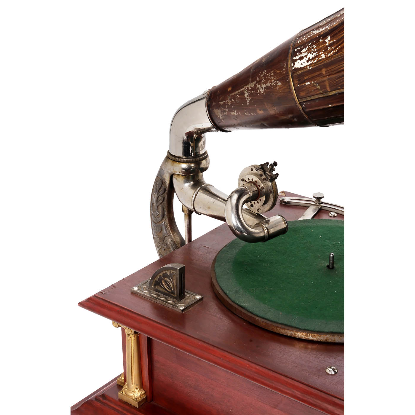 Mahogany-stained wood case with eight metal columns, 12-inch turntable, mica reproducer, 26-inch grain-painted metal horn, complex spring mechanism, with Lindström logo, missing crank, mechanism probably not complete, case replaced. An impressive gramophone.