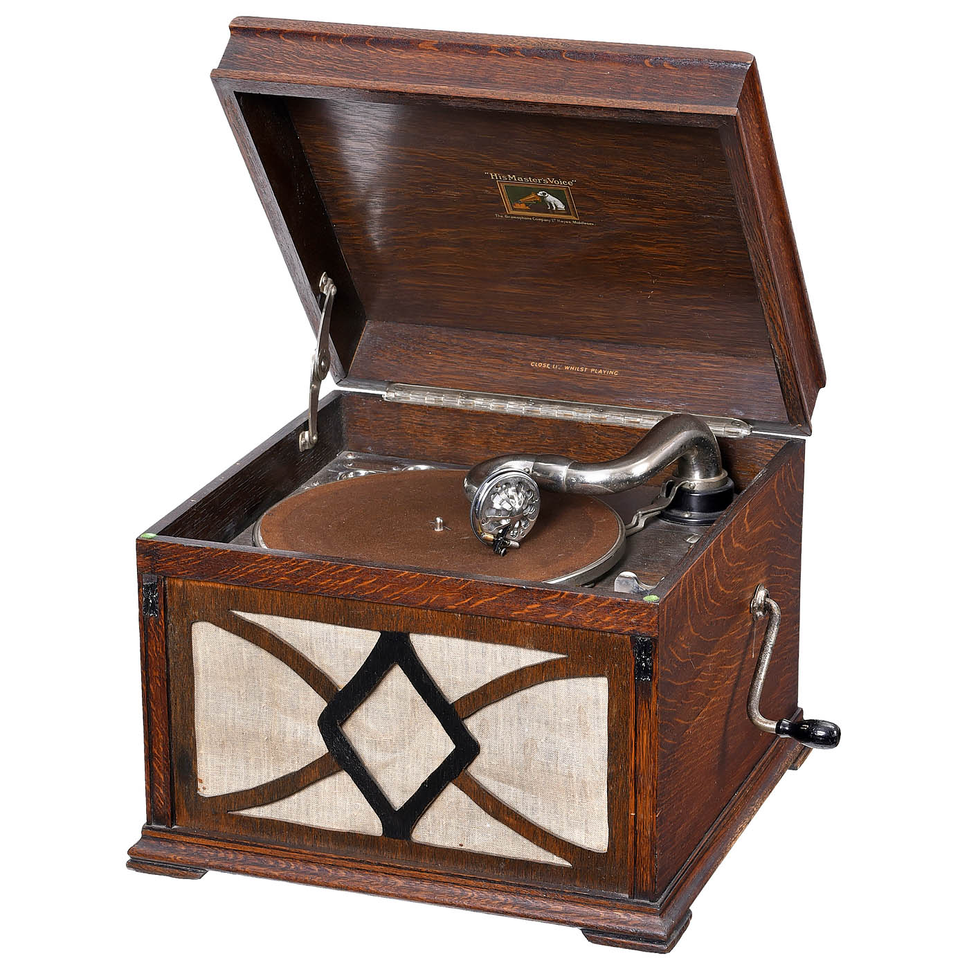 1) Horn gramophone, c. 1910, missing horn, with label "The Monarch & Gramophone", double-spring motor (working), HMV No. 2 mica reproducer, dark-oak case, with crank. – And: 2) Model 104 table grand gramophone, c. 1925, single-spring motor (working), HMV No. 5A reproducer, automatic stop (defective), oak case, with crank, good volume and playing condition.