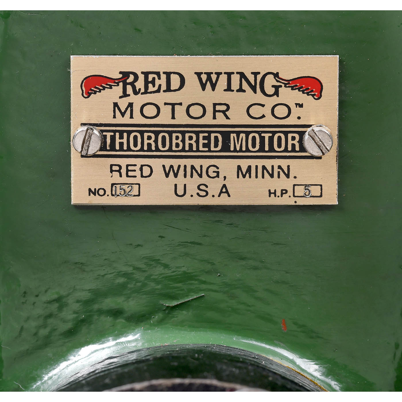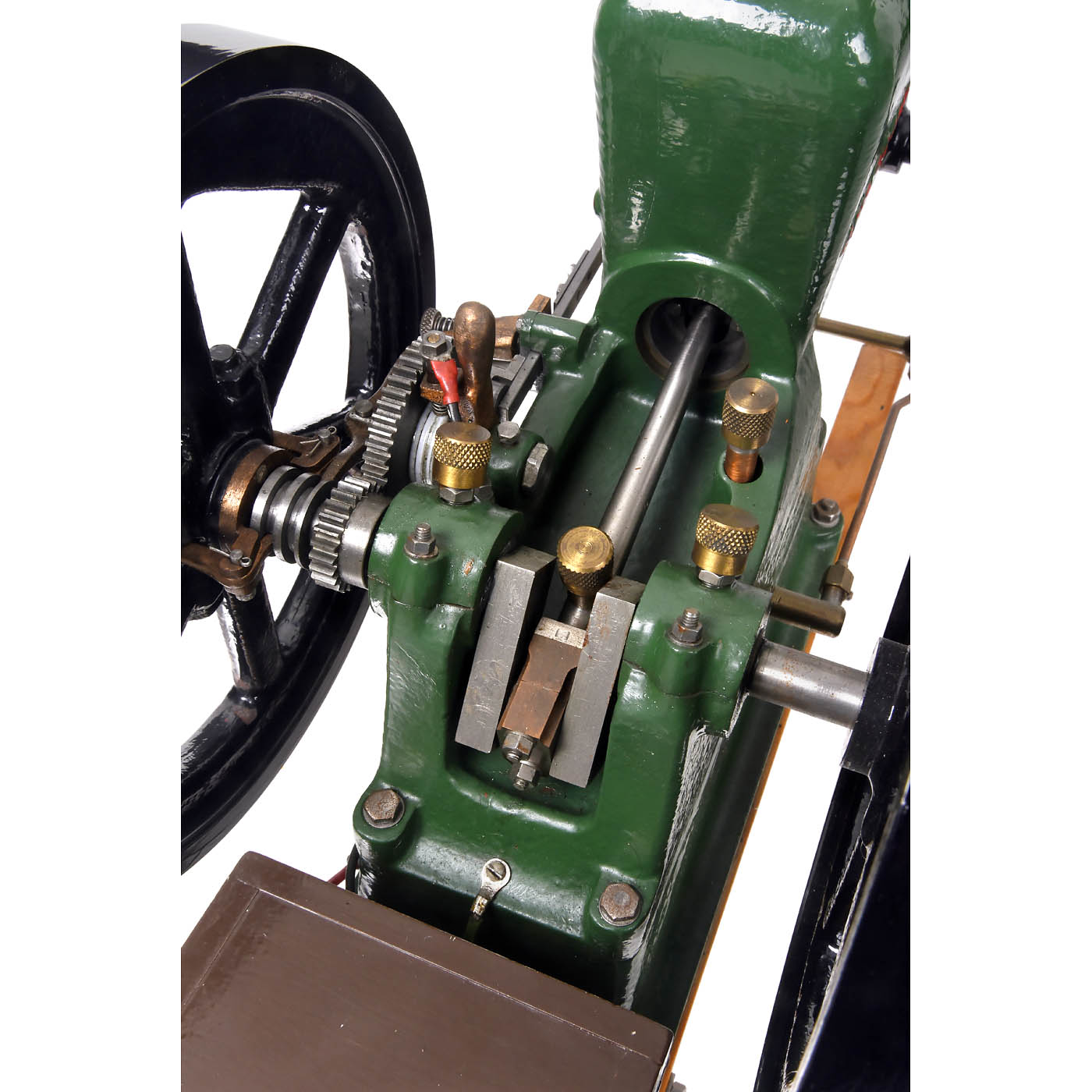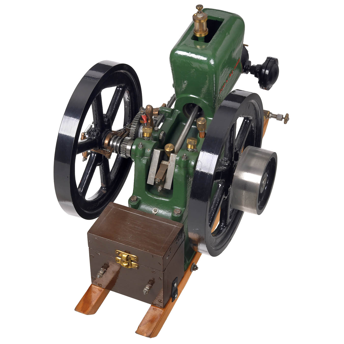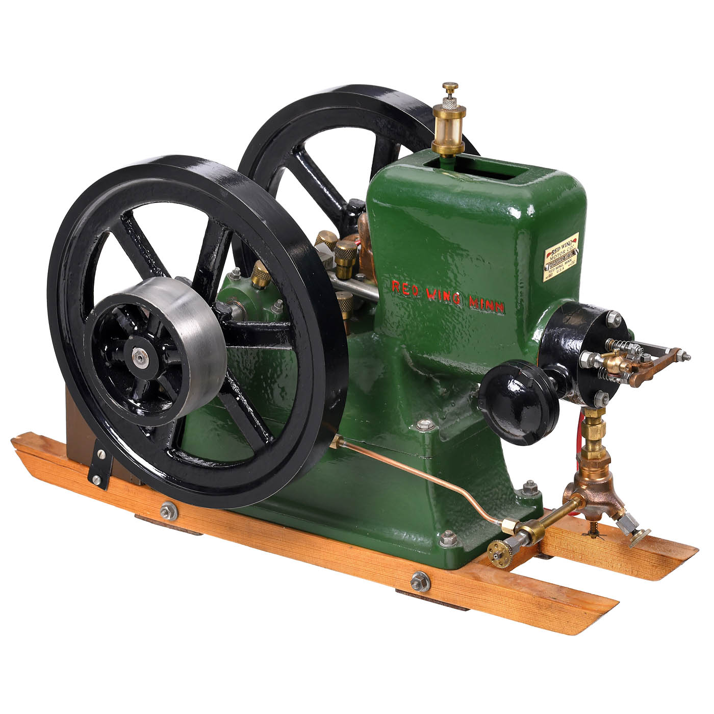 Working model of the original 5-hp Red Wing forest engine, brass, bronze, cast iron and steel, finished in green and black, bore 1¼ in. and stroke 2 in. stationary gasoline motor, with spark ignition produced by a buzz coil, 1 glass and 4 brass oilers, 2 heavy 8 in. flywheels, with belt drive, mounted on wood runners, overall dimensions 17 ¾ x 10 x 11 3/5 in.