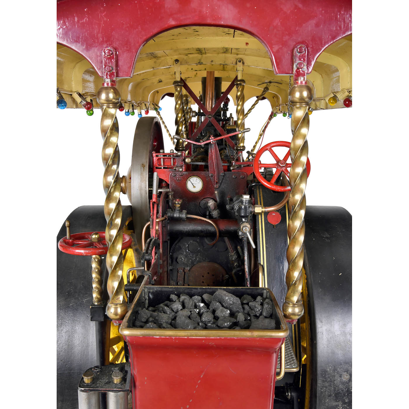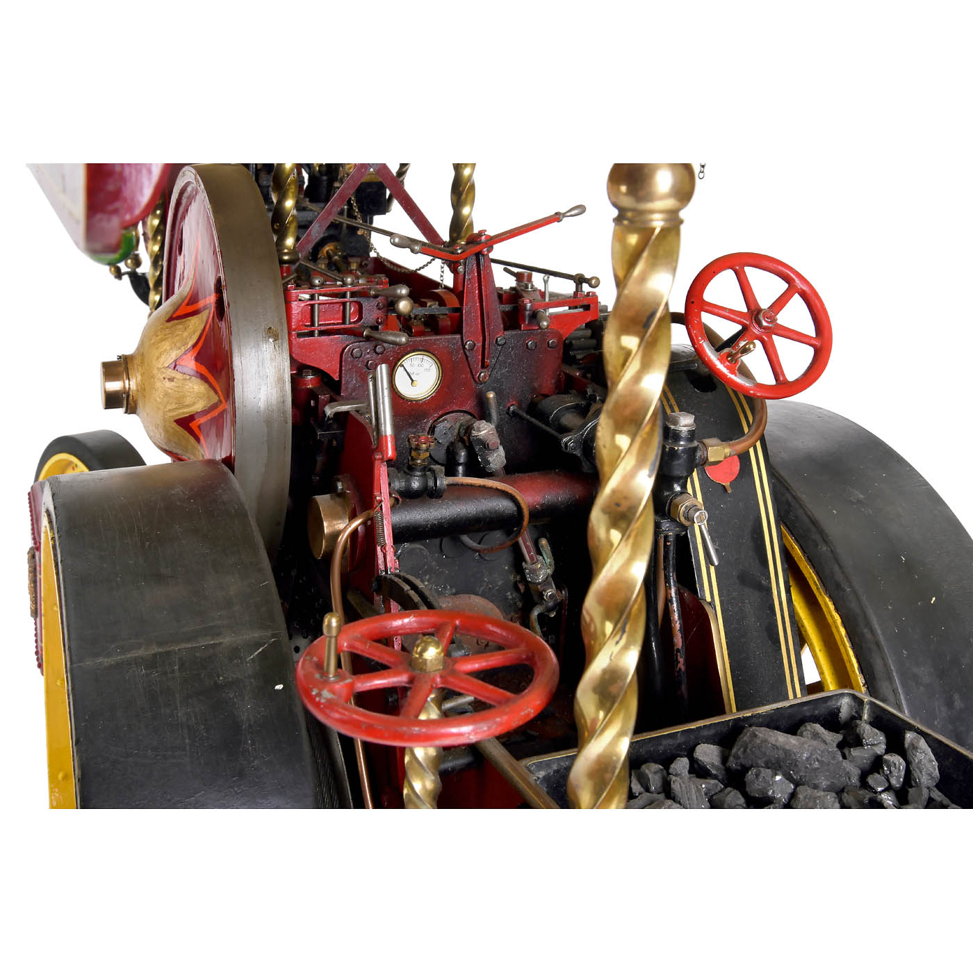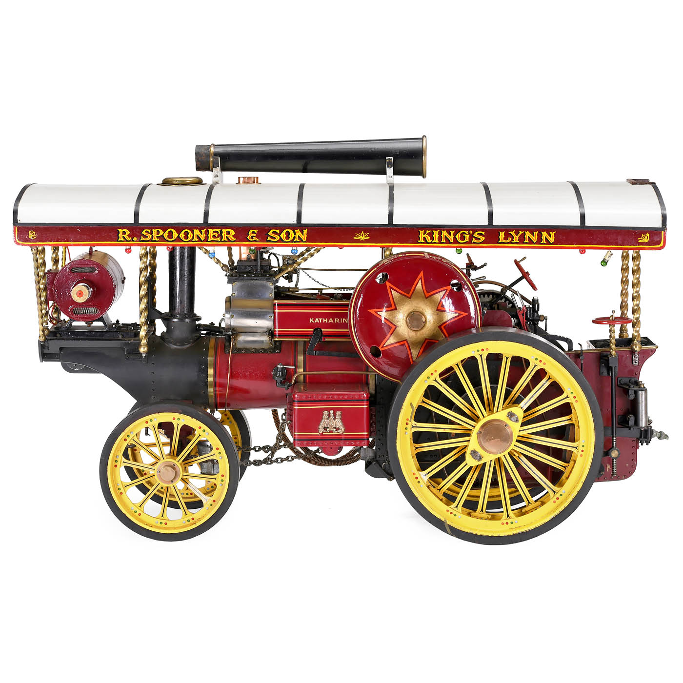 Katharine by John Folder, Leeds, coal-fired, twin-cylinder engine, Stephenson’s slide-valve gear, two-speed gearbox, flame-tube boiler, fusee-and-chain steering, reversible traction, brake, rope winch, pressure indicator, water gauge level, feed pump, spoked wheels, front Ø 8 7/8 in., rear Ø 14 1/3 in., disc flywheel Ø 9 ½ in., full-length canopy fitted with a string of lights, extension chimney, overall size: 42 ½ x 15 ½ x 24 ½ in., height with chimney 40 in., complete with all fittings. A fascinating model of first-class engineering quality.