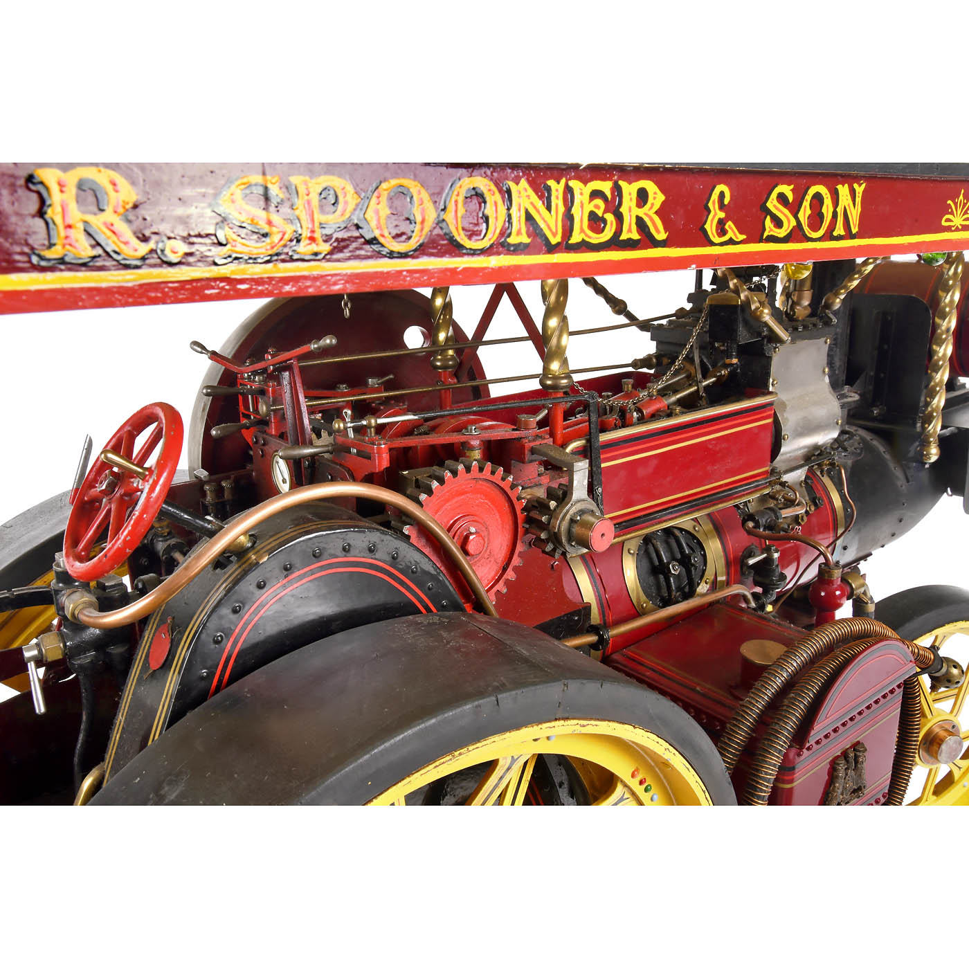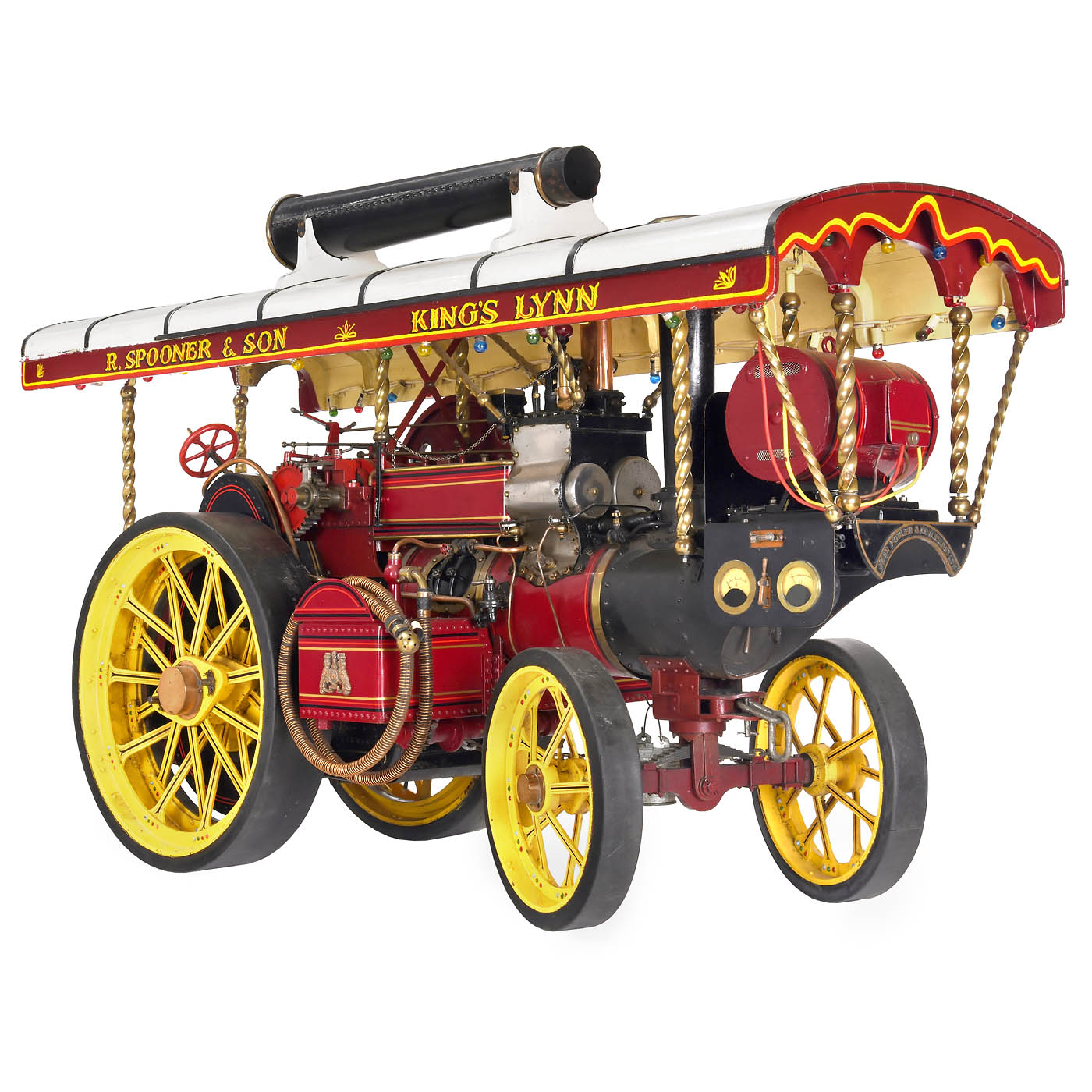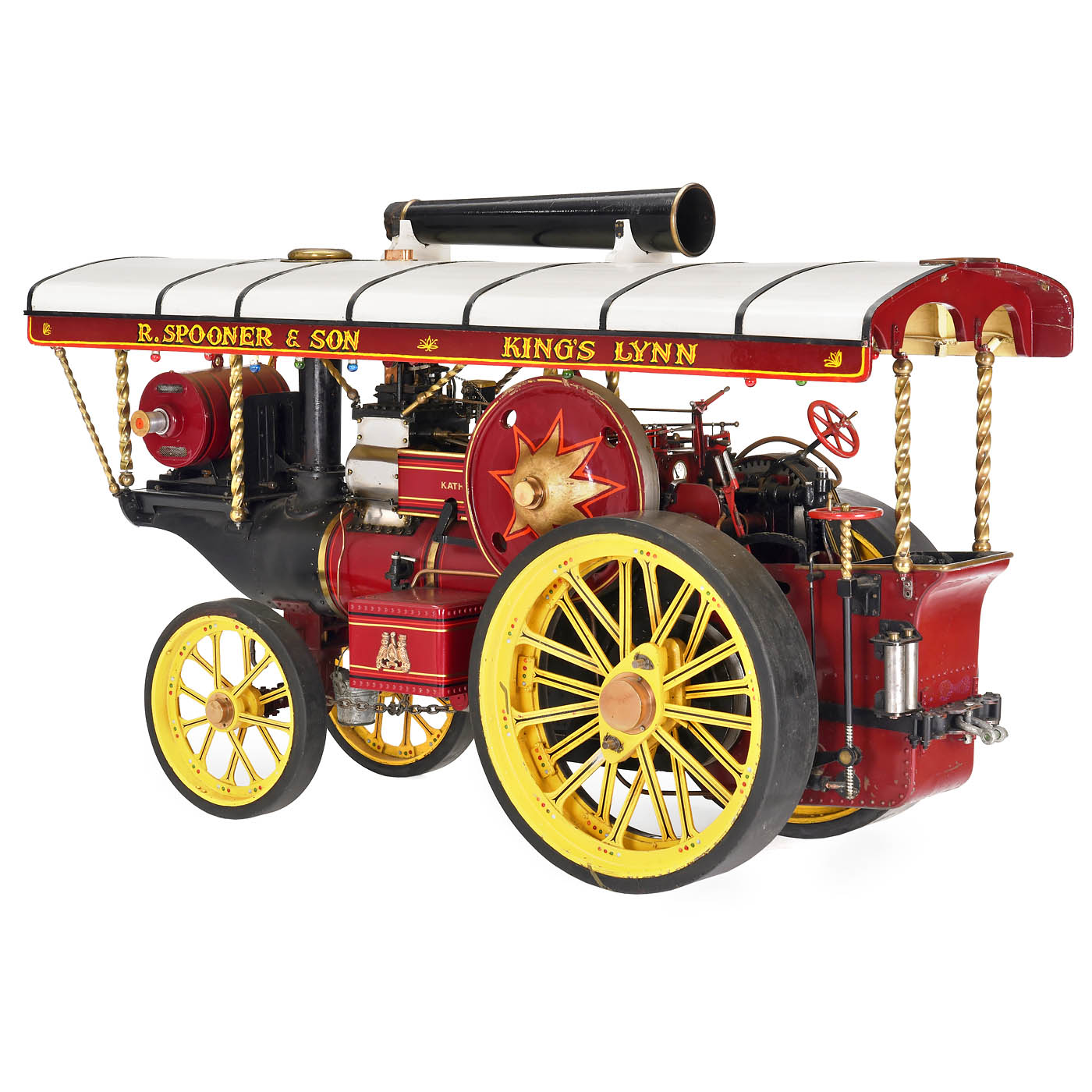 Katharine by John Folder, Leeds, coal-fired, twin-cylinder engine, Stephenson’s slide-valve gear, two-speed gearbox, flame-tube boiler, fusee-and-chain steering, reversible traction, brake, rope winch, pressure indicator, water gauge level, feed pump, spoked wheels, front Ø 8 7/8 in., rear Ø 14 1/3 in., disc flywheel Ø 9 ½ in., full-length canopy fitted with a string of lights, extension chimney, overall size: 42 ½ x 15 ½ x 24 ½ in., height with chimney 40 in., complete with all fittings. A fascinating model of first-class engineering quality.