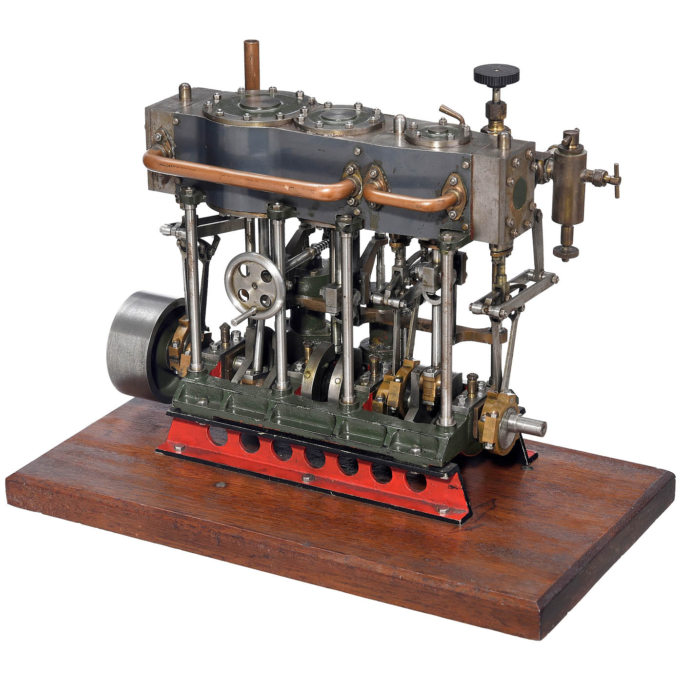 Brass, polished steel and cast metal, cylinders Ø 2 1/8,1 ¾ and 1 1/4 in., with reversible direction of rotation, sliding control with eccentric ring and reverse eccentric, crosshead guide, crankshaft with counterweights, flywheel Ø 2 1/5 in., ht. 7 4/5 in., good working condition.
