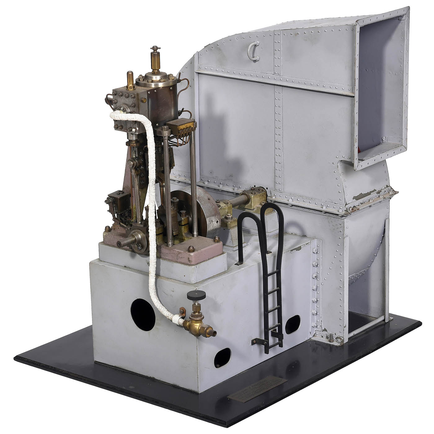Model of a fan used on the Metropolitan Railway c. 1860, sheet metal, brass and steel, single cylinder, Ø 1 7/10 in., crosshead guide in plane bearings, sliding control with eccentric ring, lagged main steam line, main stop valve, 2-bearing fan drive shaft, riveted and bolted ducting, fan Ø 7 in., brass maker's plaque "Sidney Bowles, Chief Engineer", 14 x 11 ¾ x 14 ½ in.