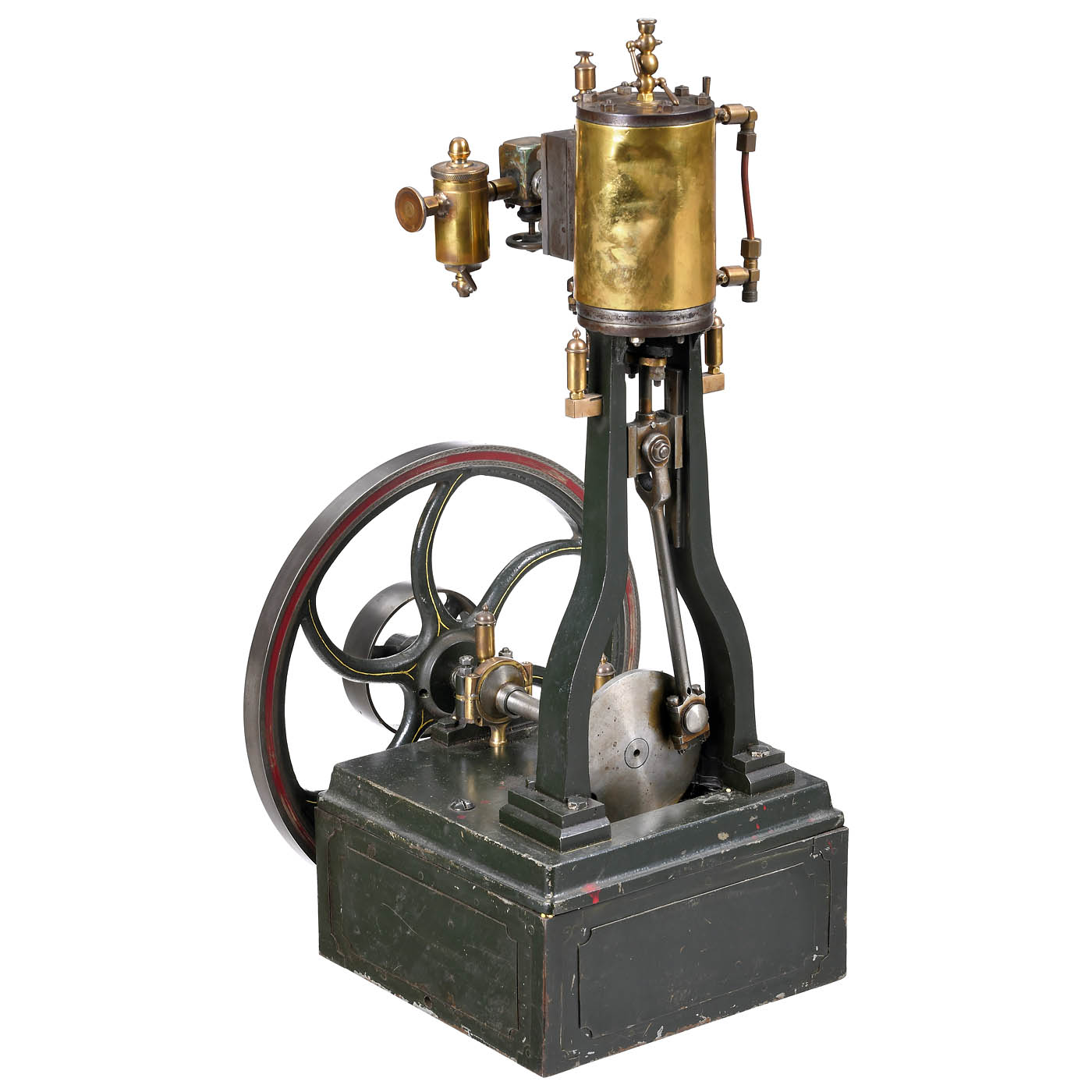 Brass, cast metal and steel, cylinder Ø 3 in., sliding control with eccentric ring, crosshead guide, 2 water drain cocks, 5 oilers, flywheel Ø 11 ¾ in., overall ht. 24 in., on cast-iron base, somewhat resinous.