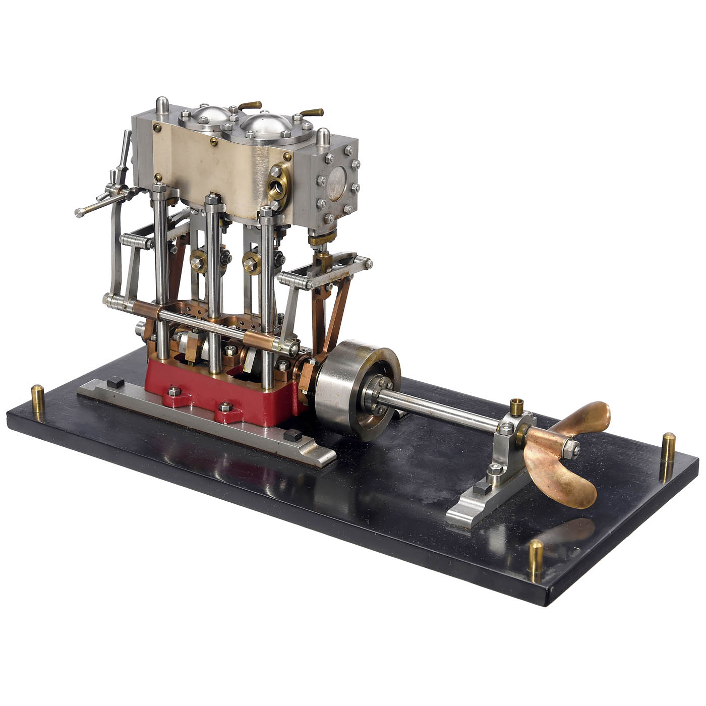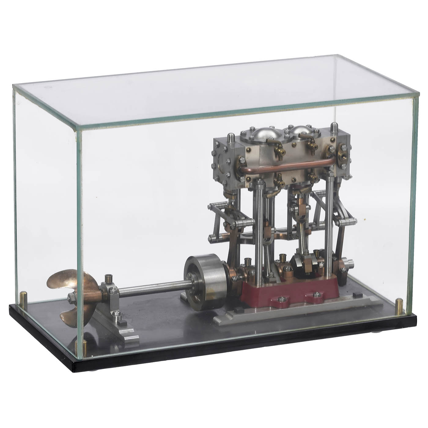 Brass, steel and cast metal, high and low-pressure cylinders, Ø 1 2/3 and 1 ¼ in., reversible, Stephenson valve gear with eccentric ring and reverse eccentric, working governor (missing belt), cast-bronze propeller, in showcase, 11 ¾ x 6 x 8 ¼ in.