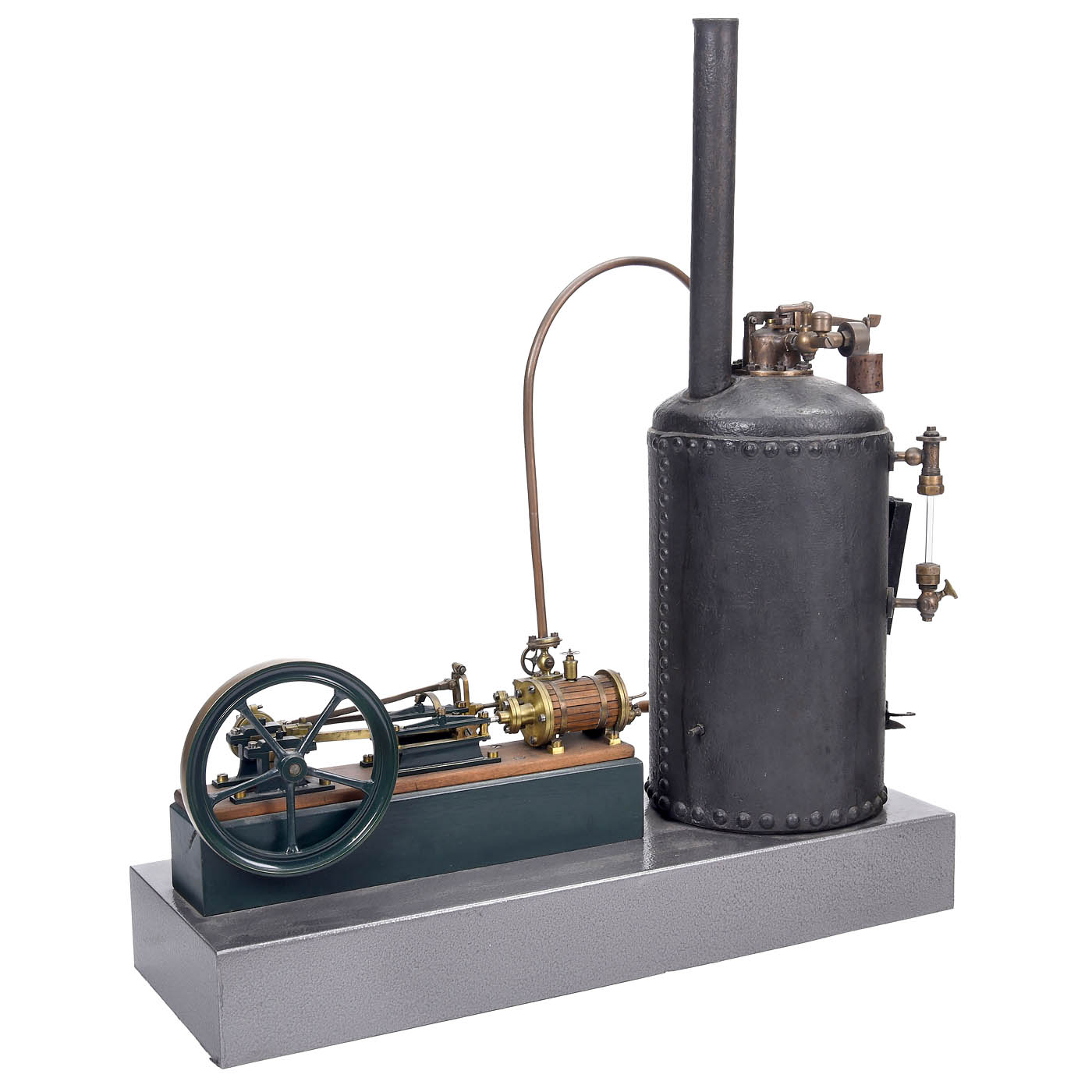 Steel, brass and cast metal, double-action mahogany-planked single-cylinder, Ø 2 1/3 in., crosshead guide in plain bearings, with reversible direction of rotation, sliding control with eccentric ring and reverse eccentric, spoked 7 1/2-inch flywheel, large coal-fired riveted steel boiler, height 17 1/3 in., Ø 13 in., with safety valve, water gauge level, manometer and draincock, on metal base, 30 1/3 x 10 1/5 in.
