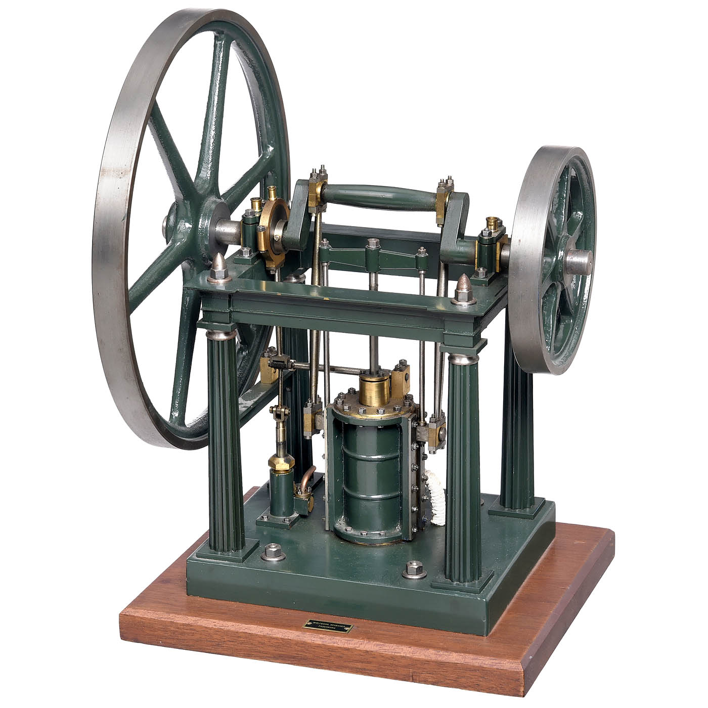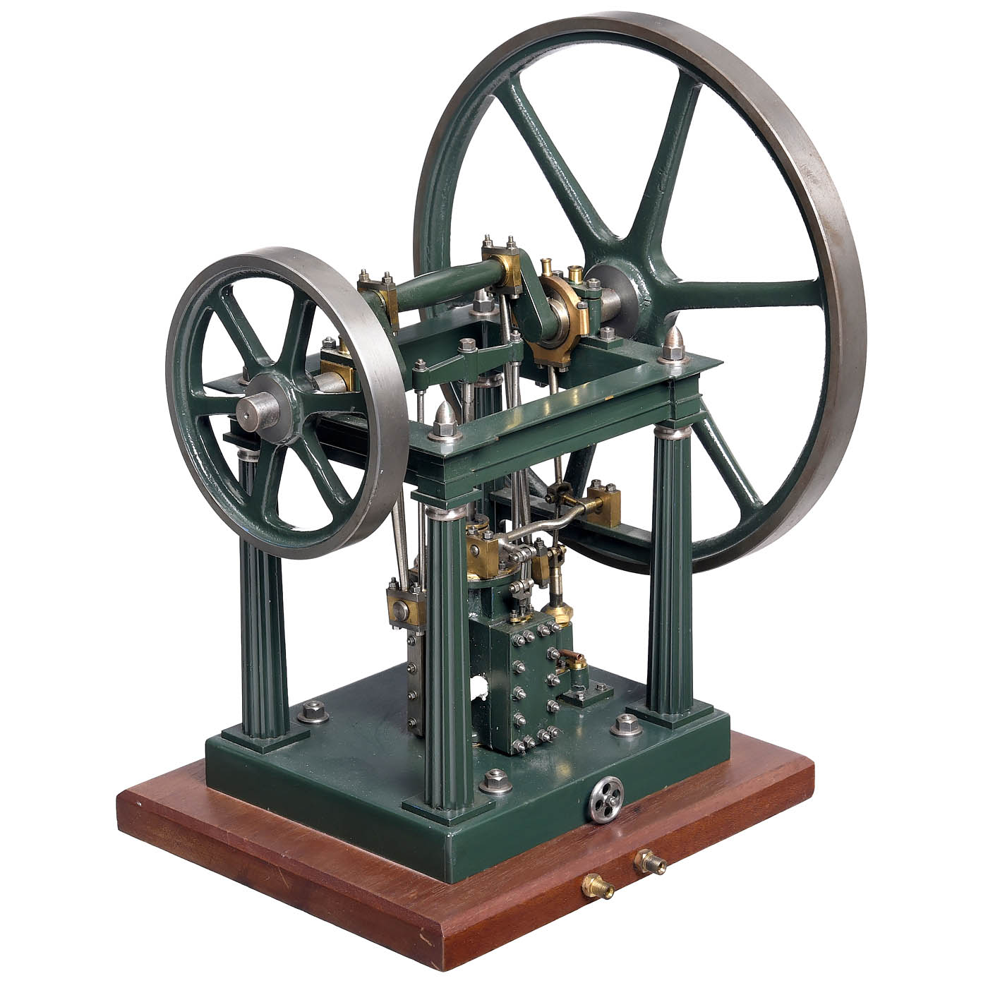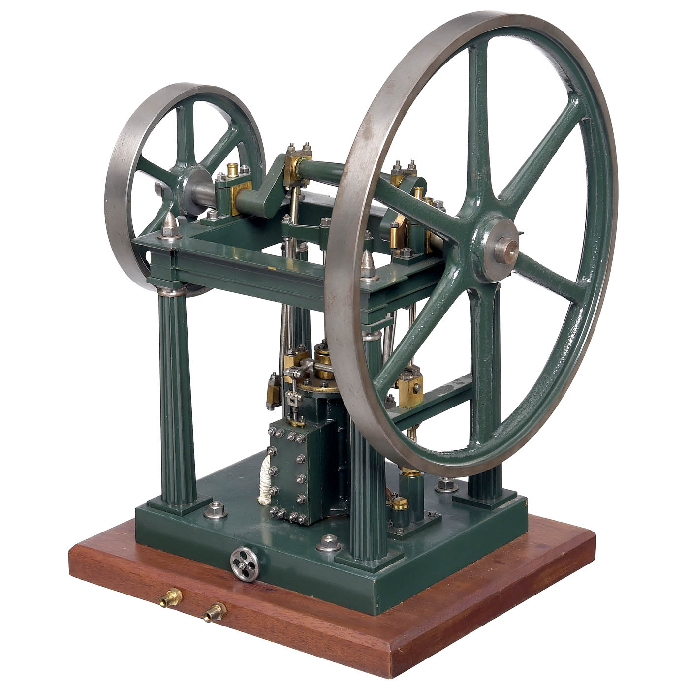 Made by Wolfgang Neubauer, Paderborn, Germany. Polished-steel, cast-iron and brass construction, cylinder with vertical piston rod, power transmission via two lateral rods to the crankshaft, valve control with shaft attached to the pump rod, cylinder Ø 1 3/4 in., spoked flywheel Ø 9 in., belt drive Ø 4 ½ in., on wood base, overall dimensions 12 ¼ x 7 ¼ x 12 ¼ in. – An unusual construction, well-built and in working condition.