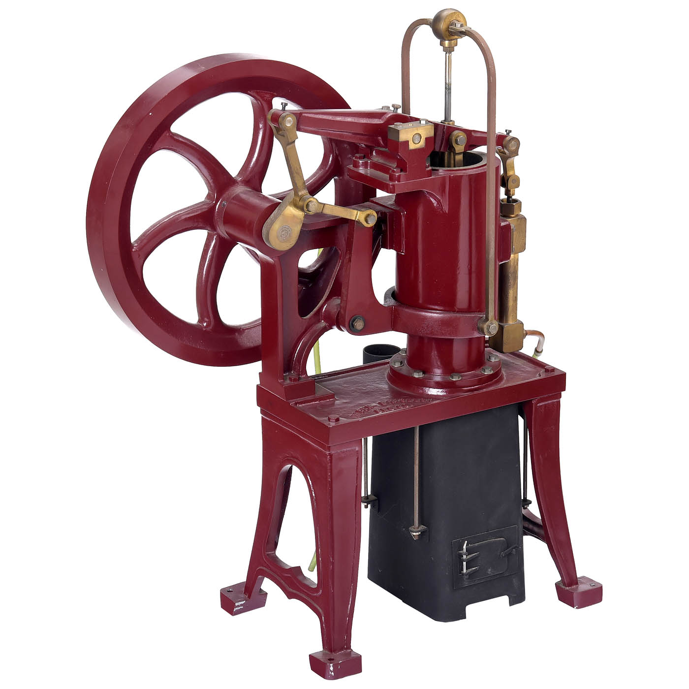After the American original machine from 1888, power piston and displacer within one cylinder, water-cooled, 8 ¾-inch flywheel, overall size 14 1/5 x 7 ½ x 20 in., without burner. – A well-constructed working model.
