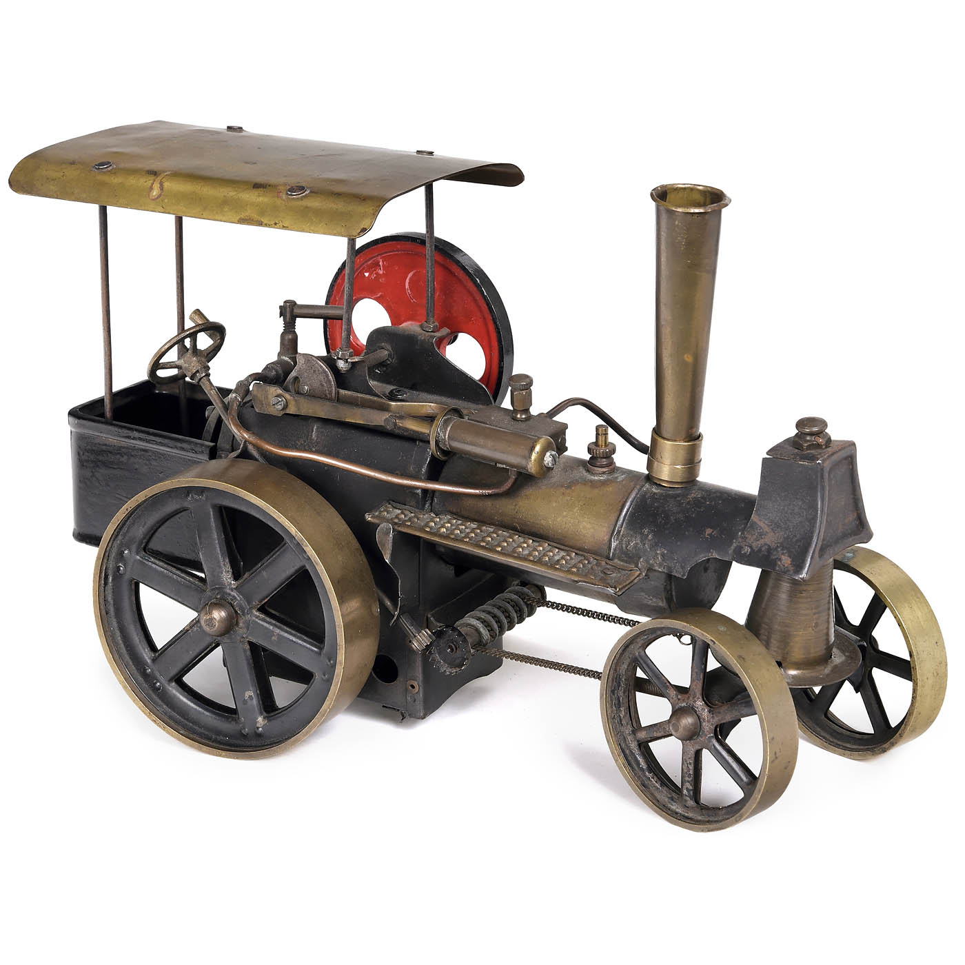 Single-cylinder steam engine, Esbit-heated boiler, cast-iron flywheel, worm-and-roller chain steering, length 12 ¼ in.