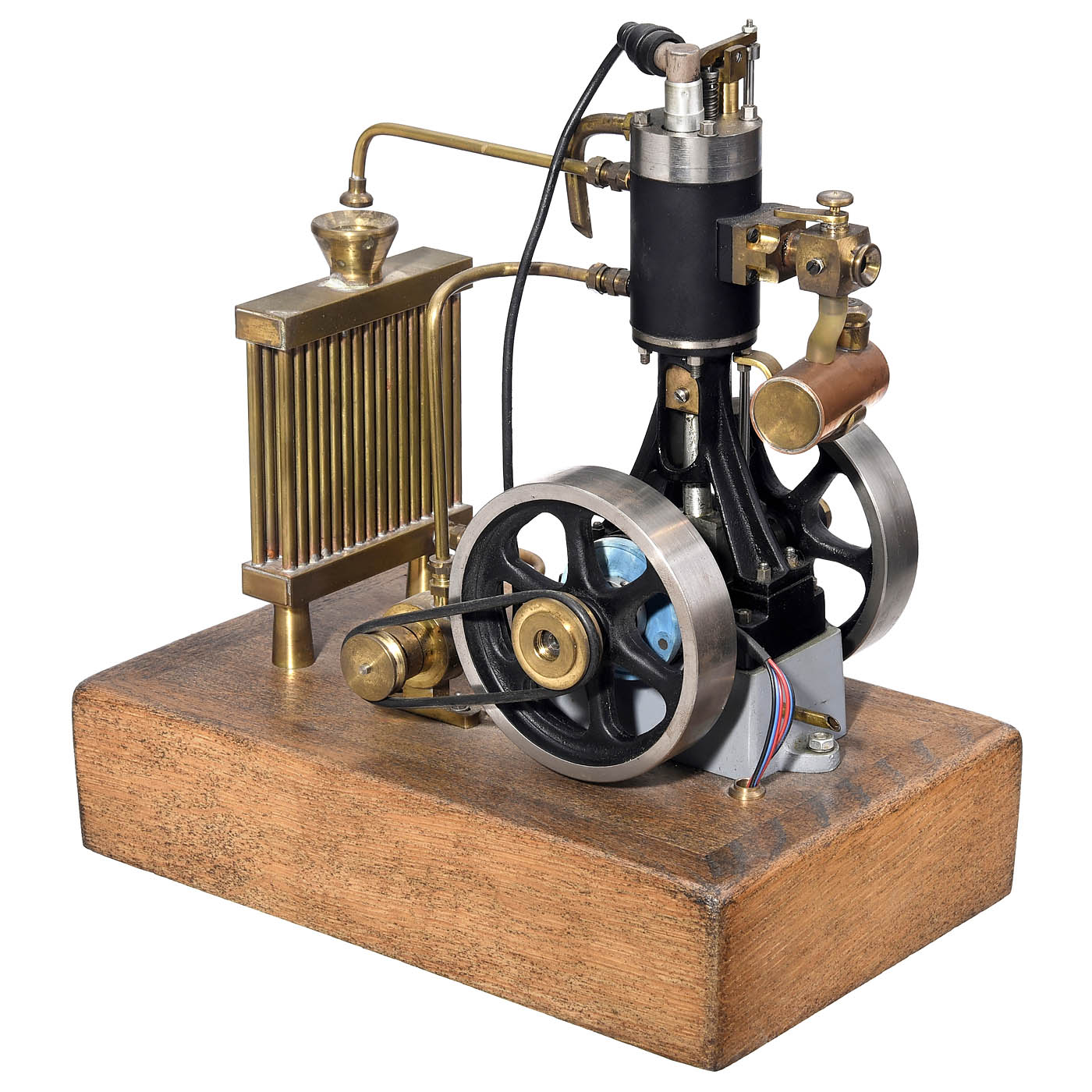 Water-cooled four-stroke petrol engine, ignition with breaker and ignition coil, pistons with crosshead guide, frame in classic "A" construction, water pump, soldered radiator with 32 pipes, on wood base, 9 ½ x 6 in., height 10 ½ in.