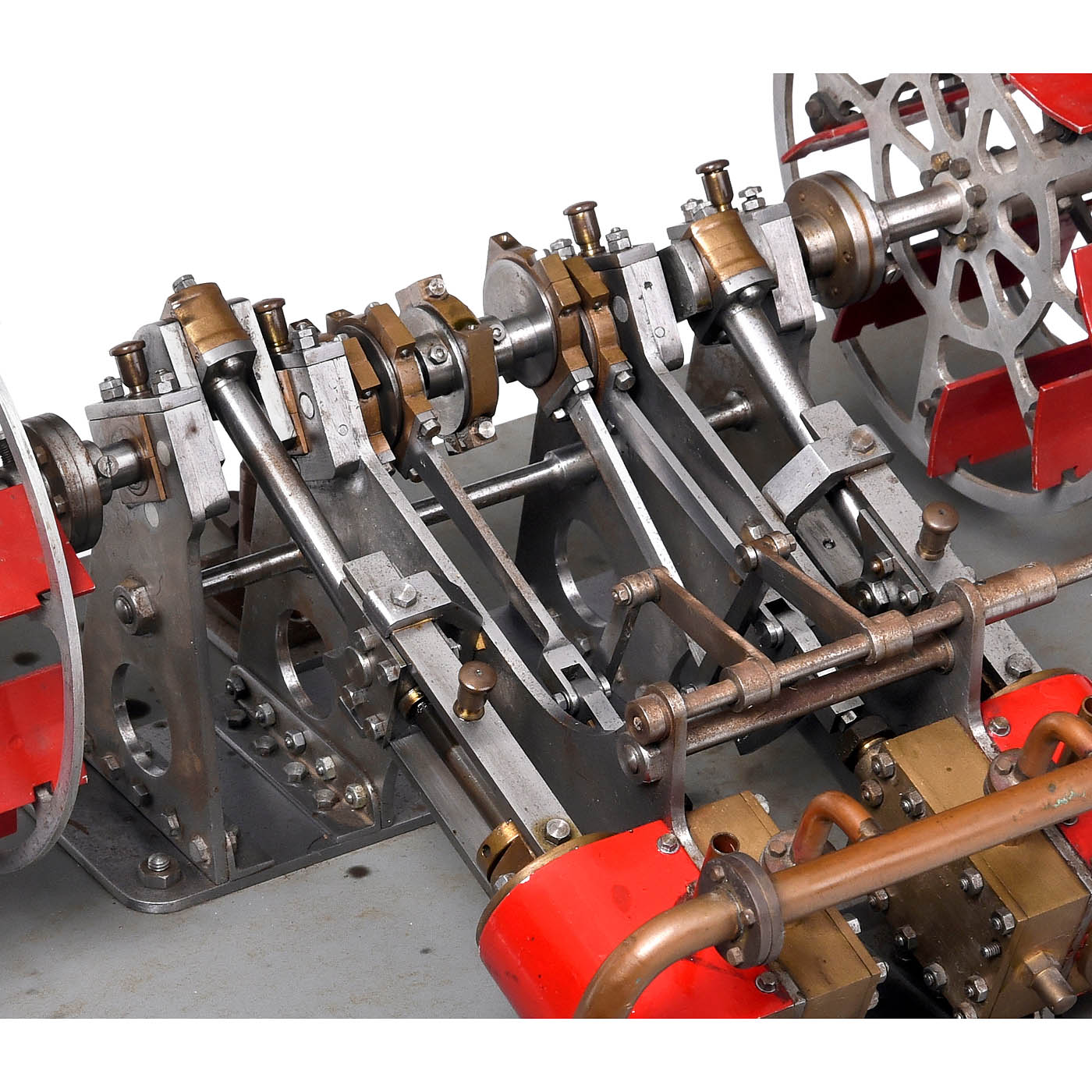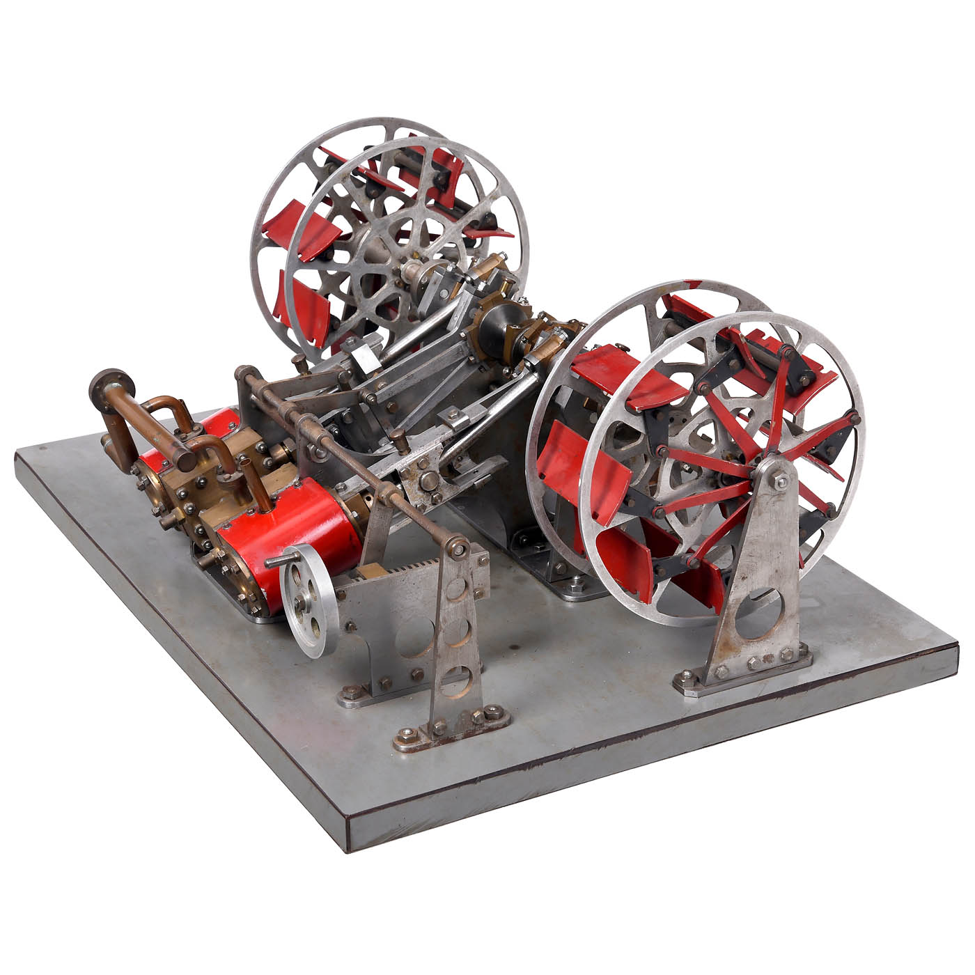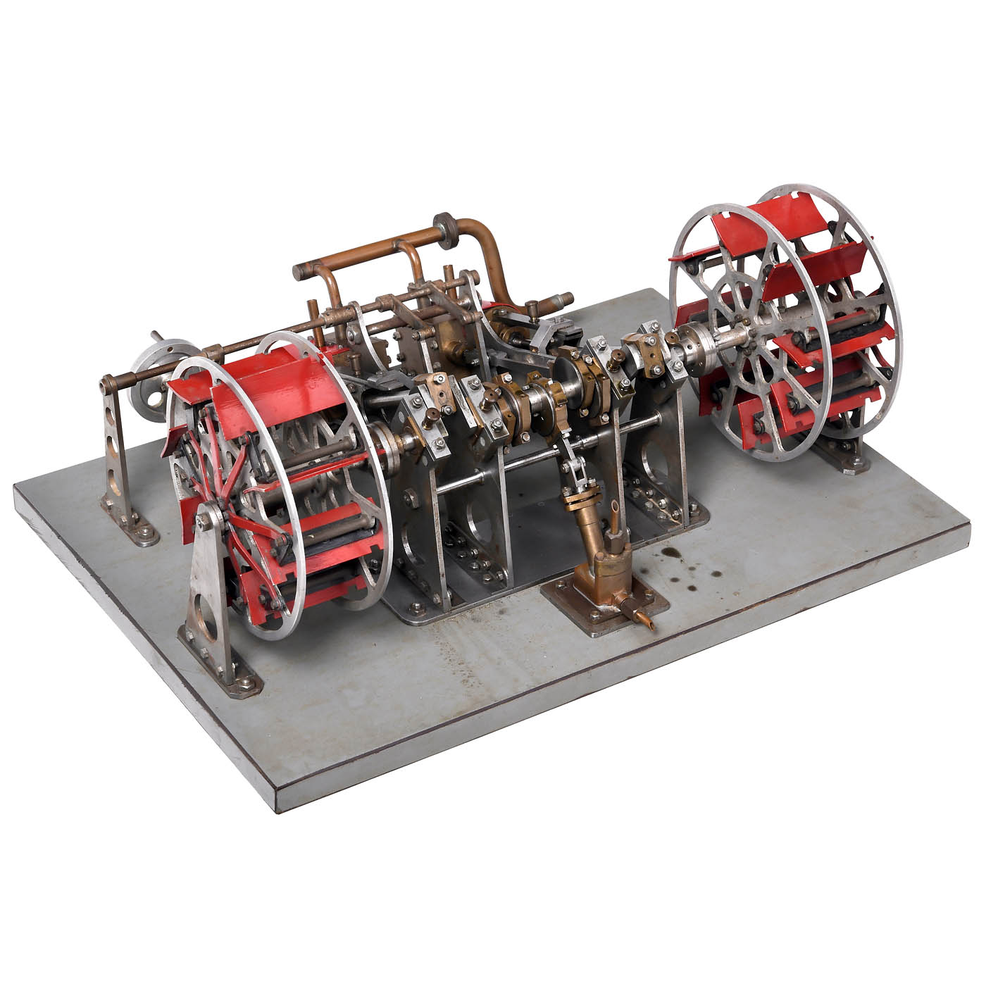 Finely-engineered working model, brass, steel and aluminum, with two Ø 1 ½ in. cylinders, Stephenson's link reversing, bar-type crosshead guide, eccentric-driven feed pump, two 5 ¾ in. wheels with 8 feathering paddles each, on grey-lacquered wood base, 17 1/3 x 12 ½ in., in need of cleaning, tested with pressure air, working.