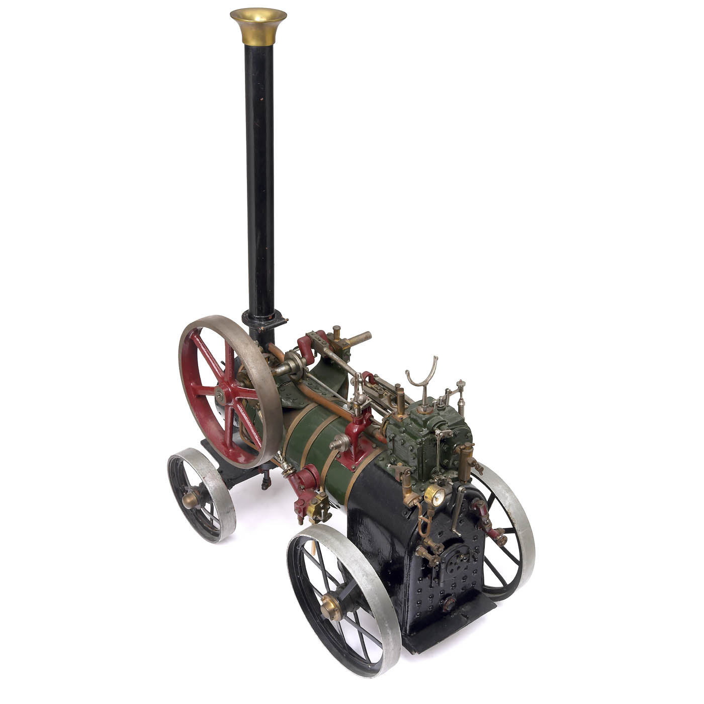 English working model of a British Allchin single-cylinder engine, polished-steel, cast-iron and brass construction, coal-fired, flame-tube boiler, pressure indicator, water gauge level, feed pump, working governor, folding chimney, spoked wheels, front Ø 4 3/5 in., rear Ø 6 1/2 in., flywheel Ø 6 3/5 in., overall size 17 x 8 ½ x 24 3/4 in. – A detailed live steam model with all its fixtures and fittings.