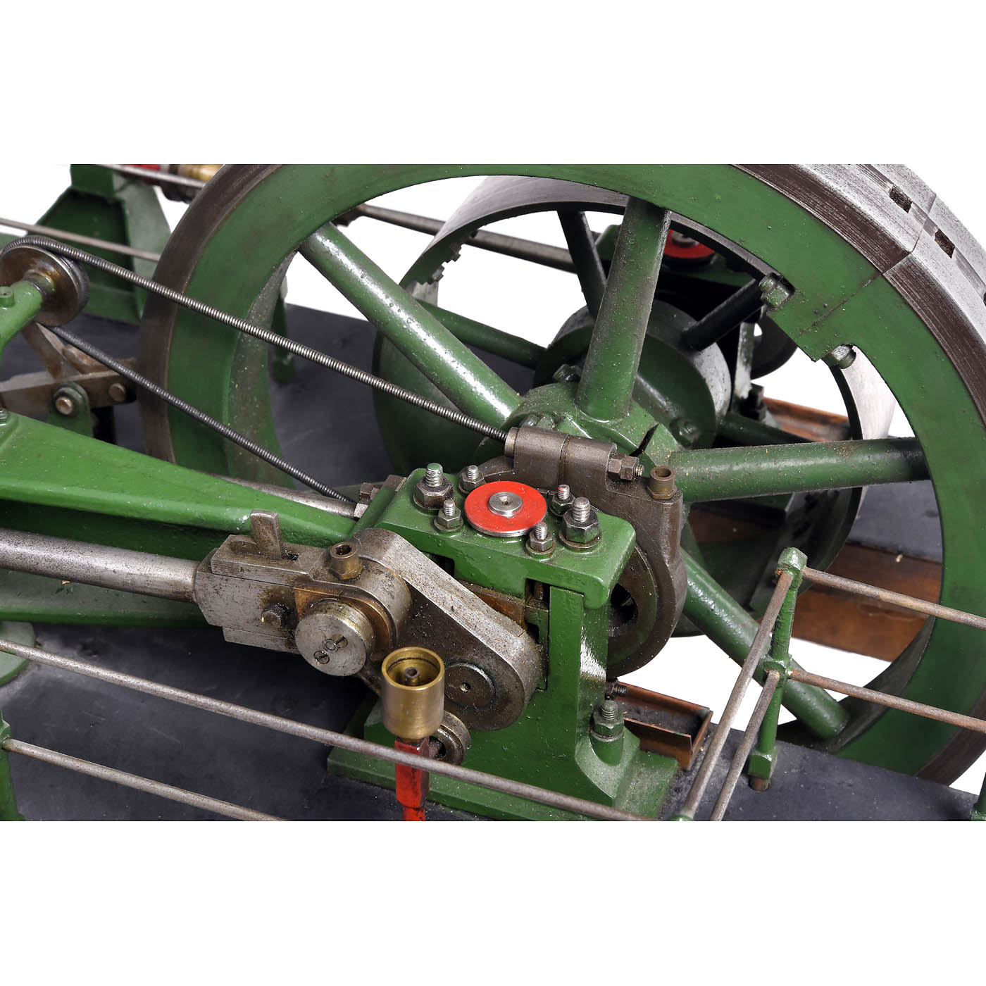 Steel, brass and cast metal, 2 3/4-inch double-action cylinder, crosshead guide in tubular bearing, eccentric rod slide-valve control, working governor, oil container, pump, spoked 10 4/5-inch flywheel, 6-inch belt drive, on cast-iron plate and wood plinth, 33 x 12 in.